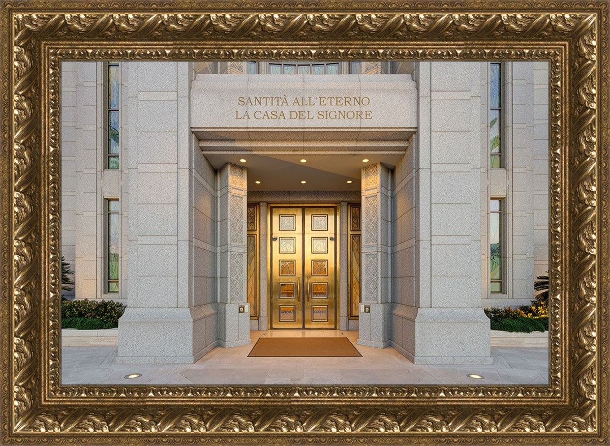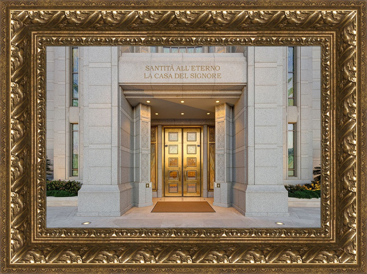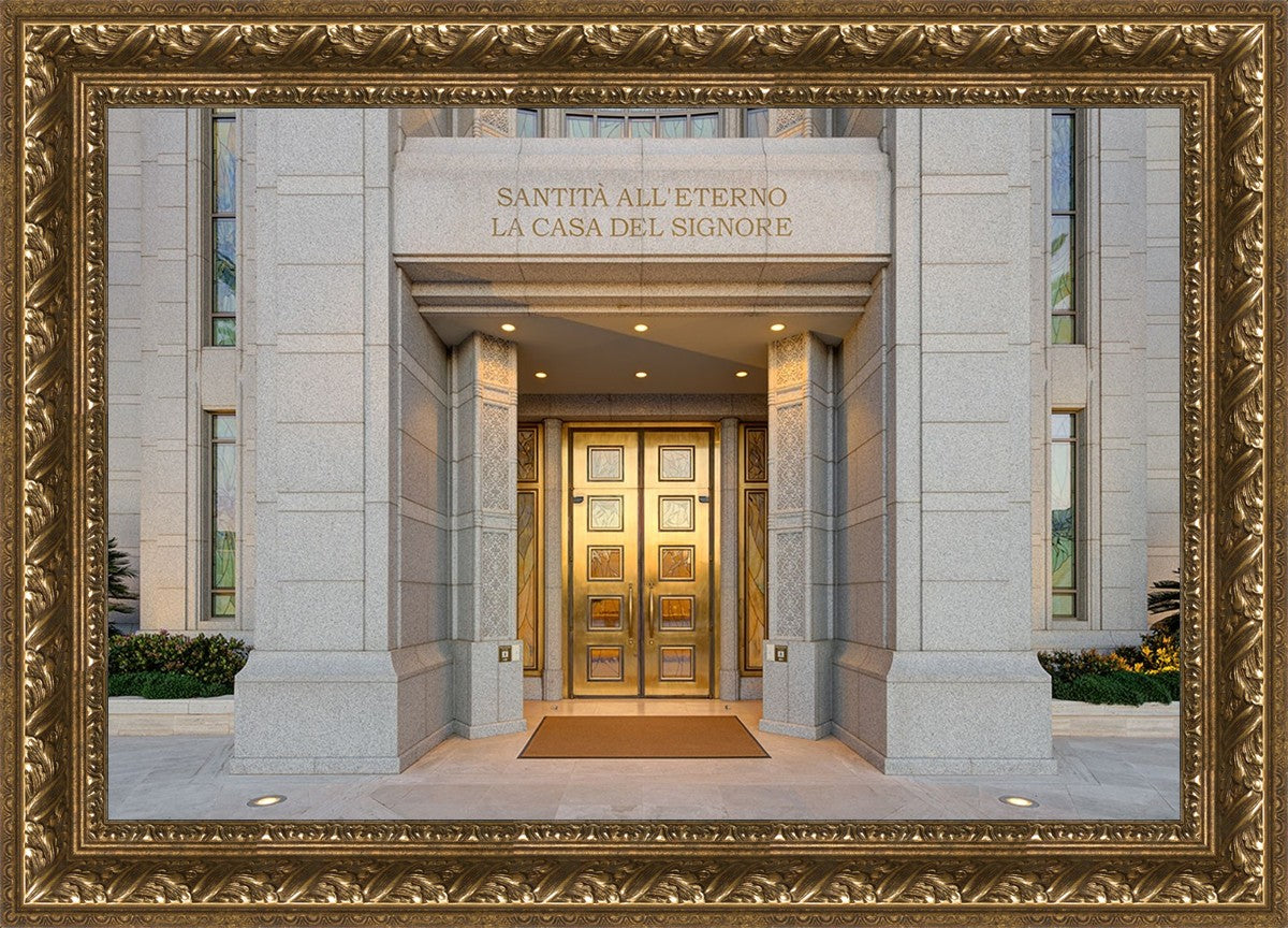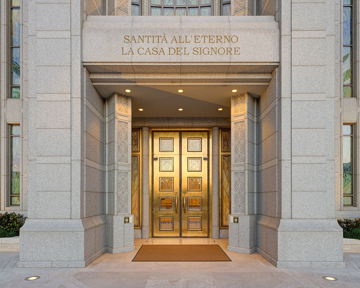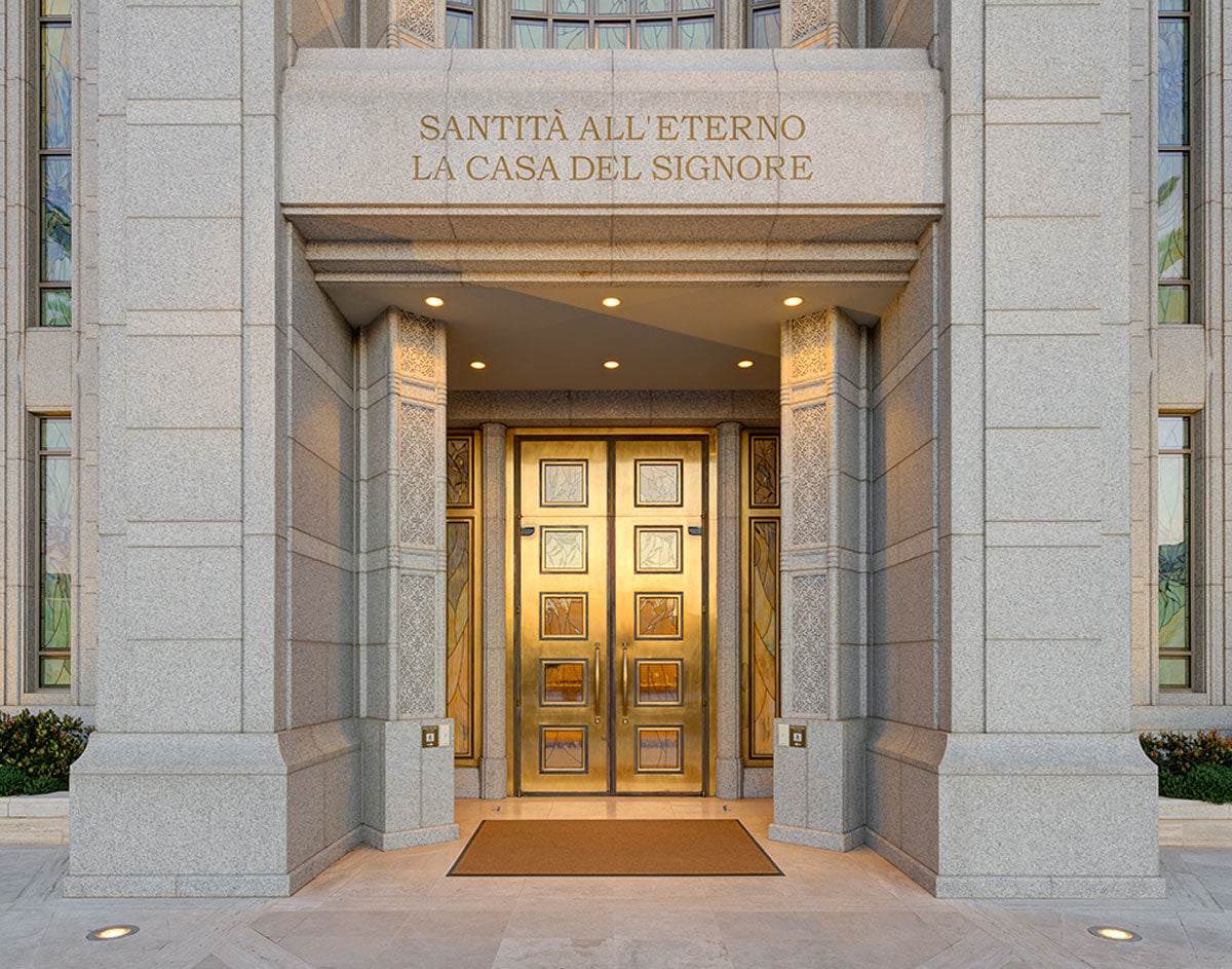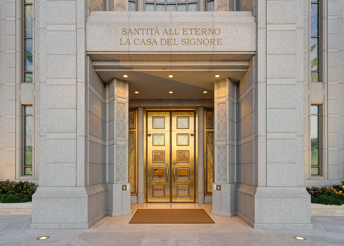 The entrance to the Rome Temple with the inscription above "Santita all'eterno la casa del signore"