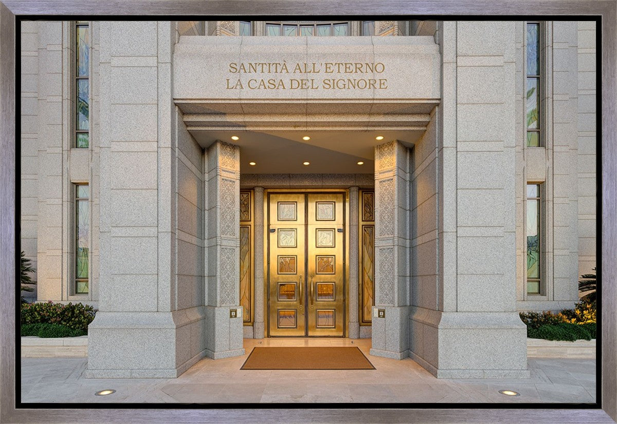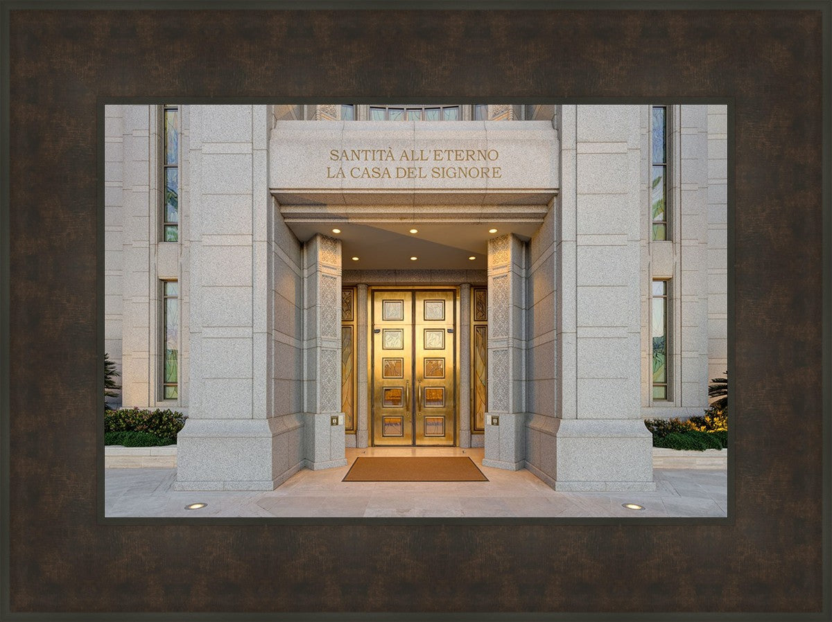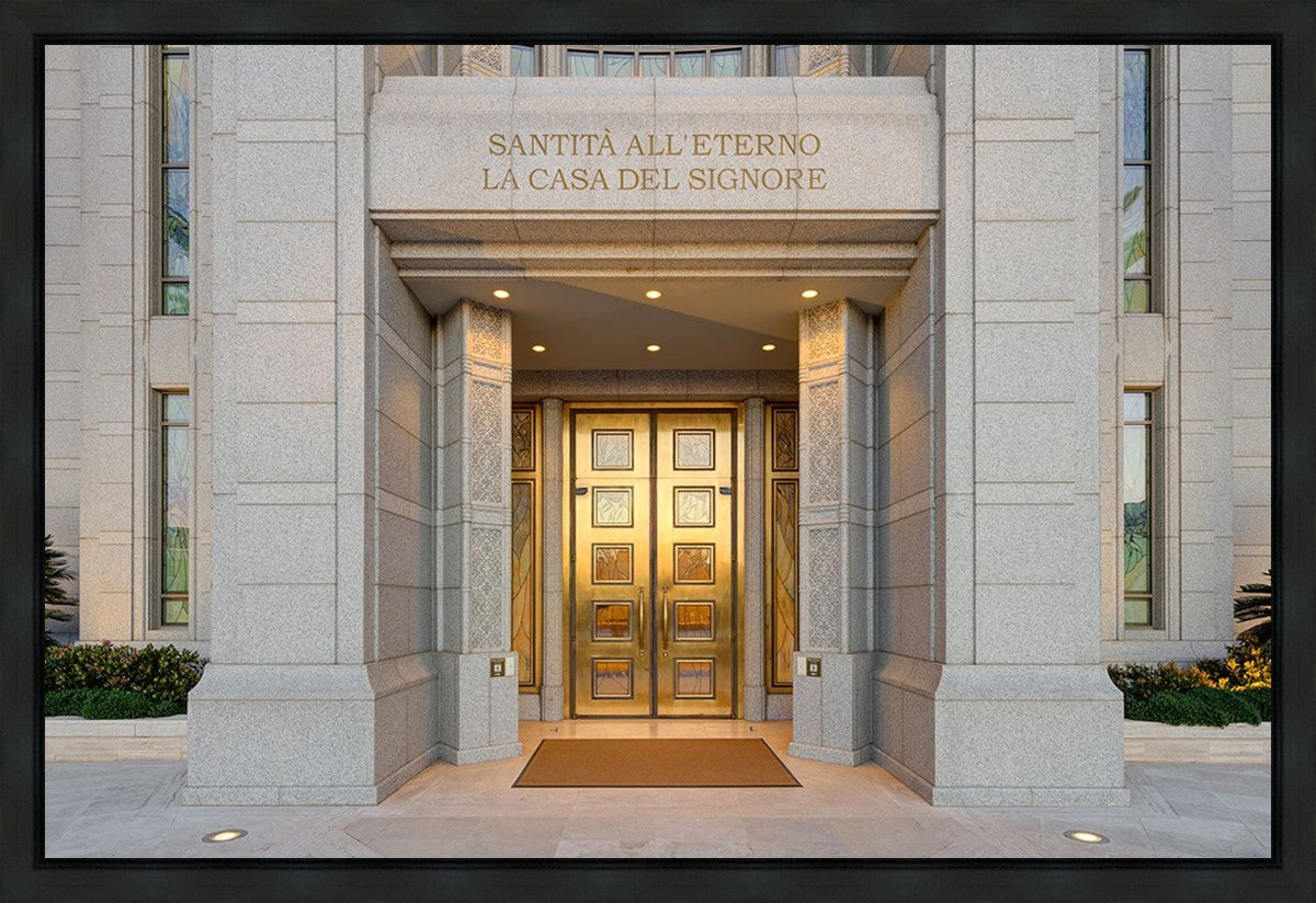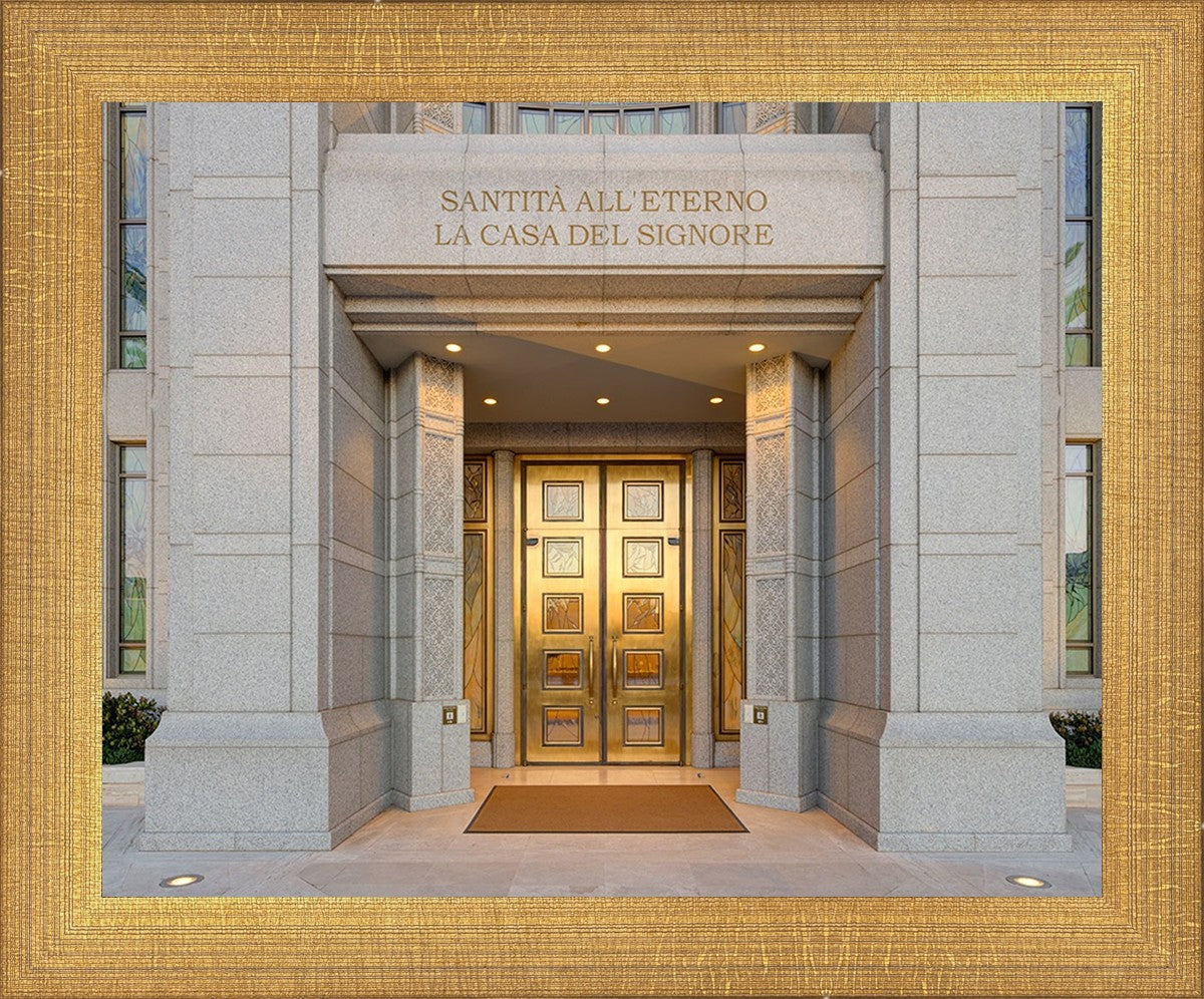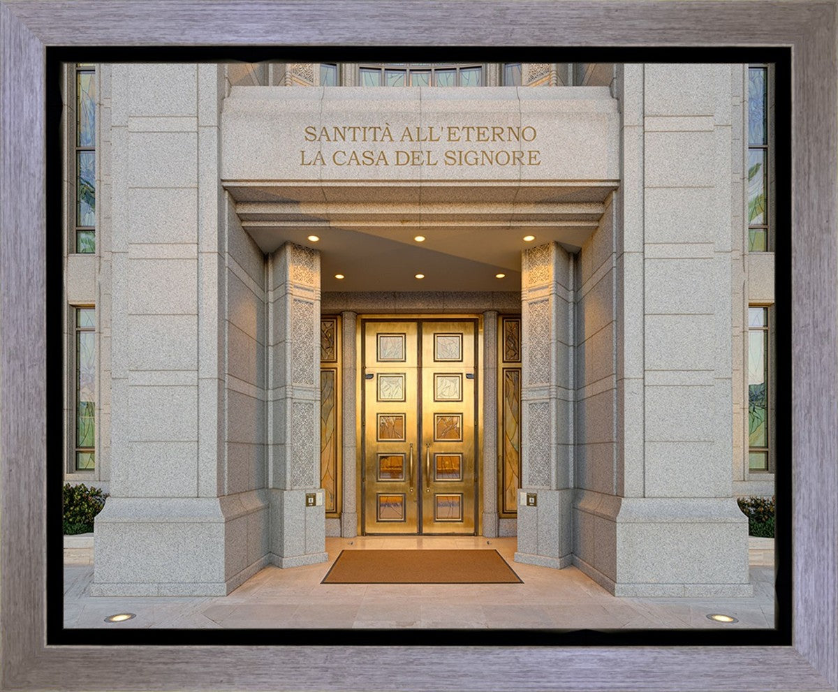The entrance to the Rome Temple with the inscription above "Santita all'eterno la casa del signore"