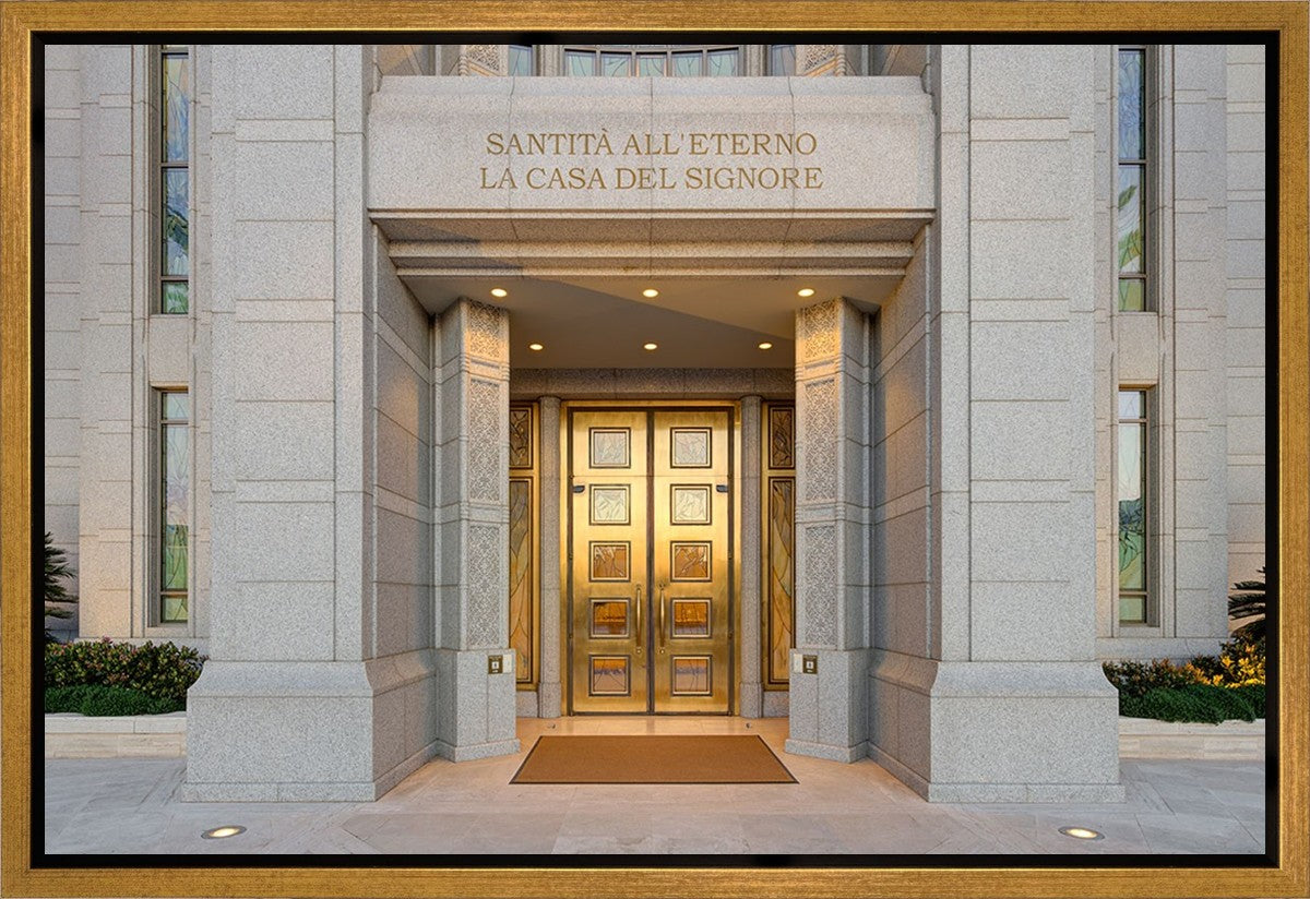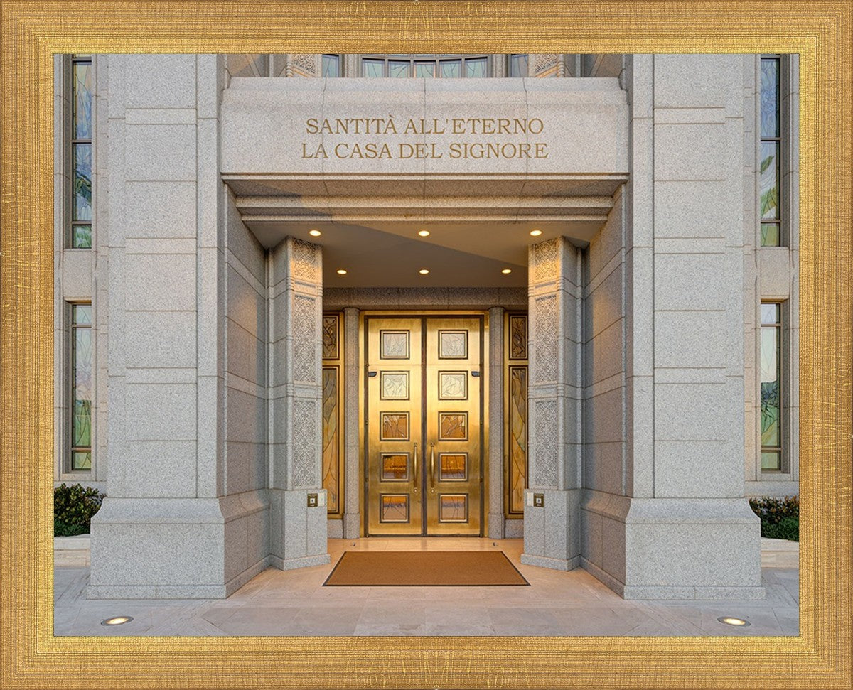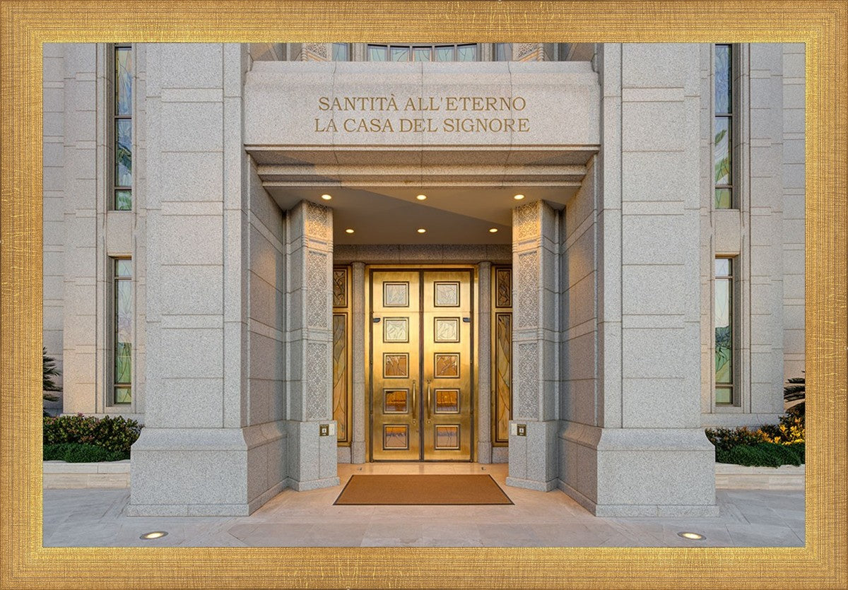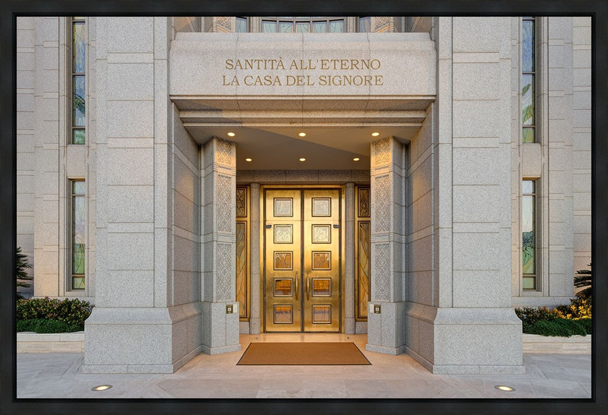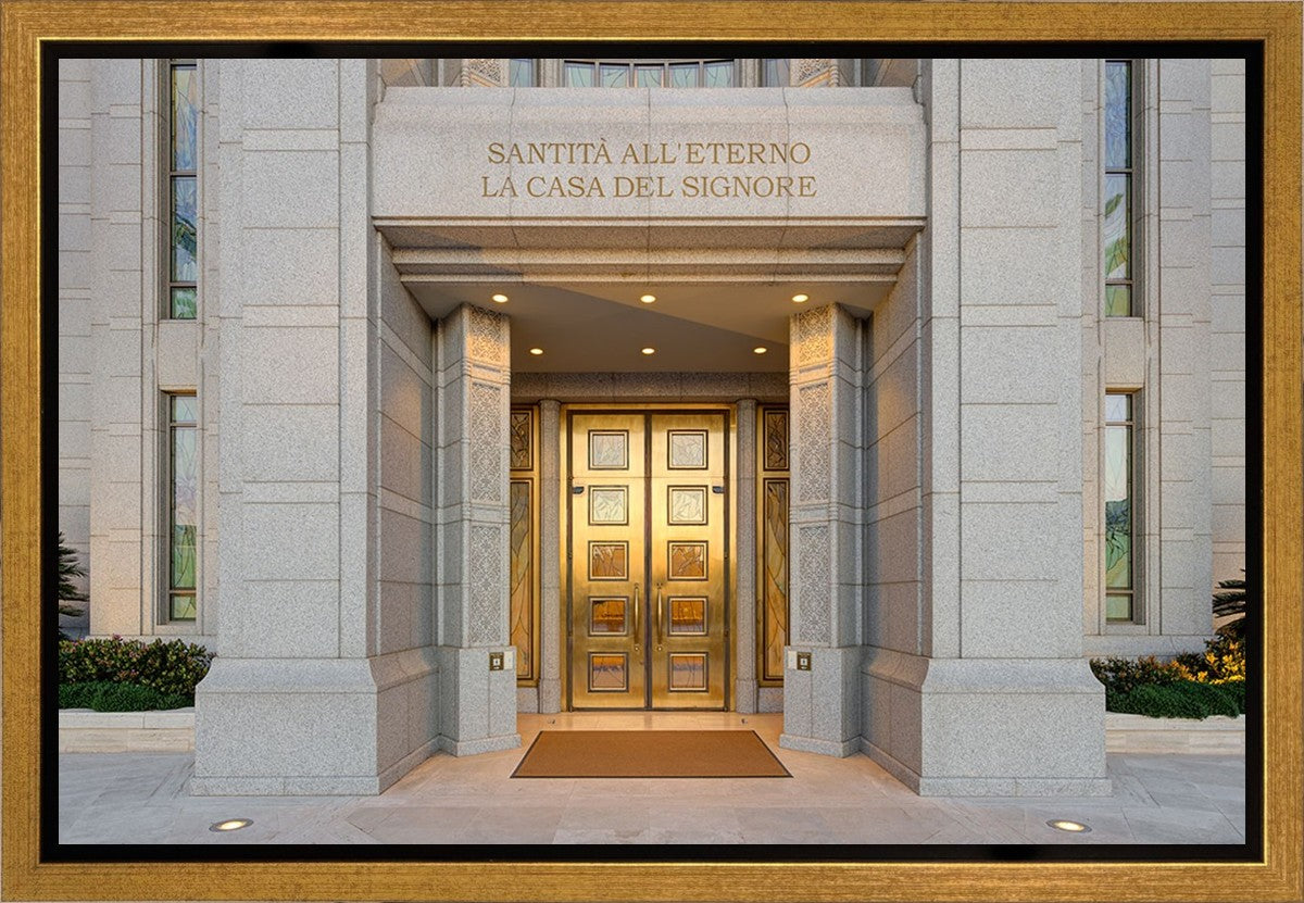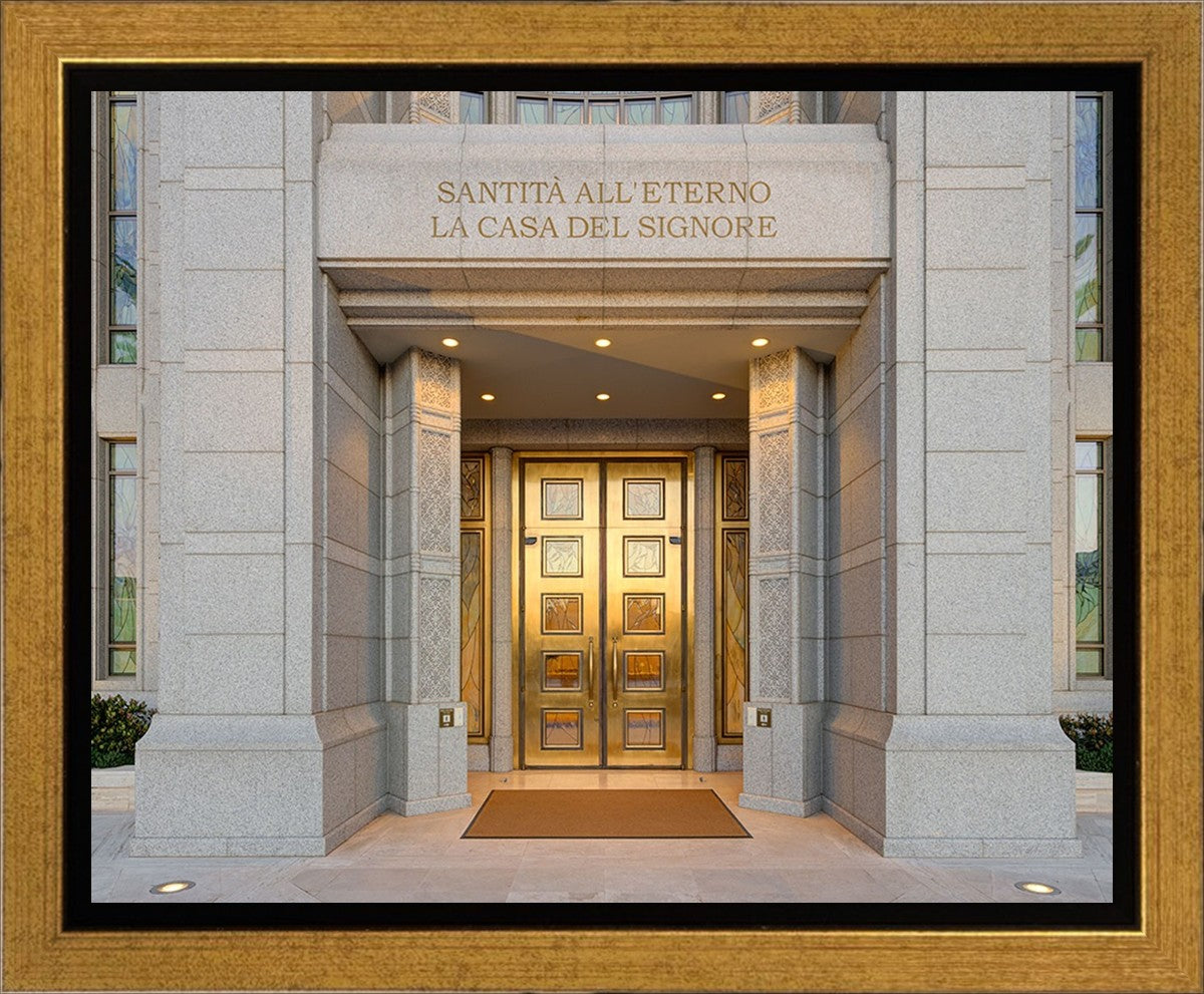 The entrance to the Rome Temple with the inscription above "Santita all'eterno la casa del signore"