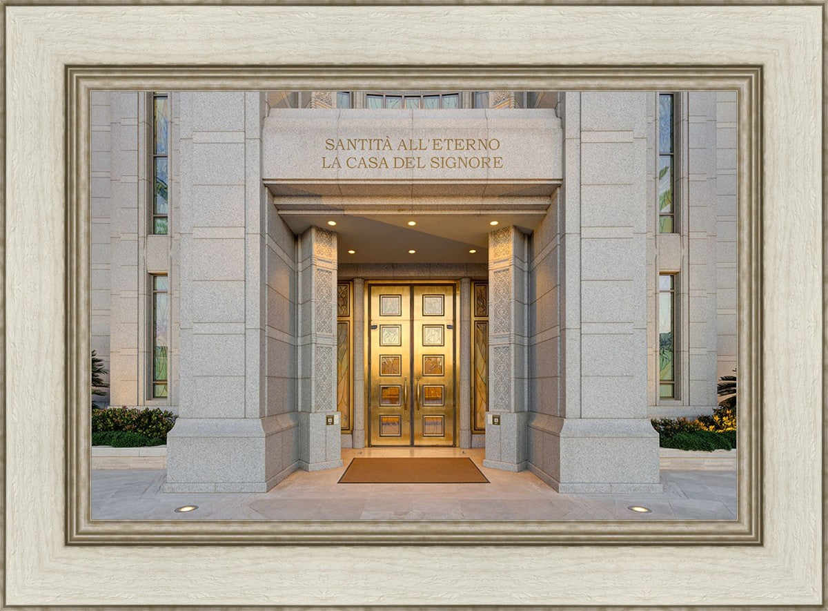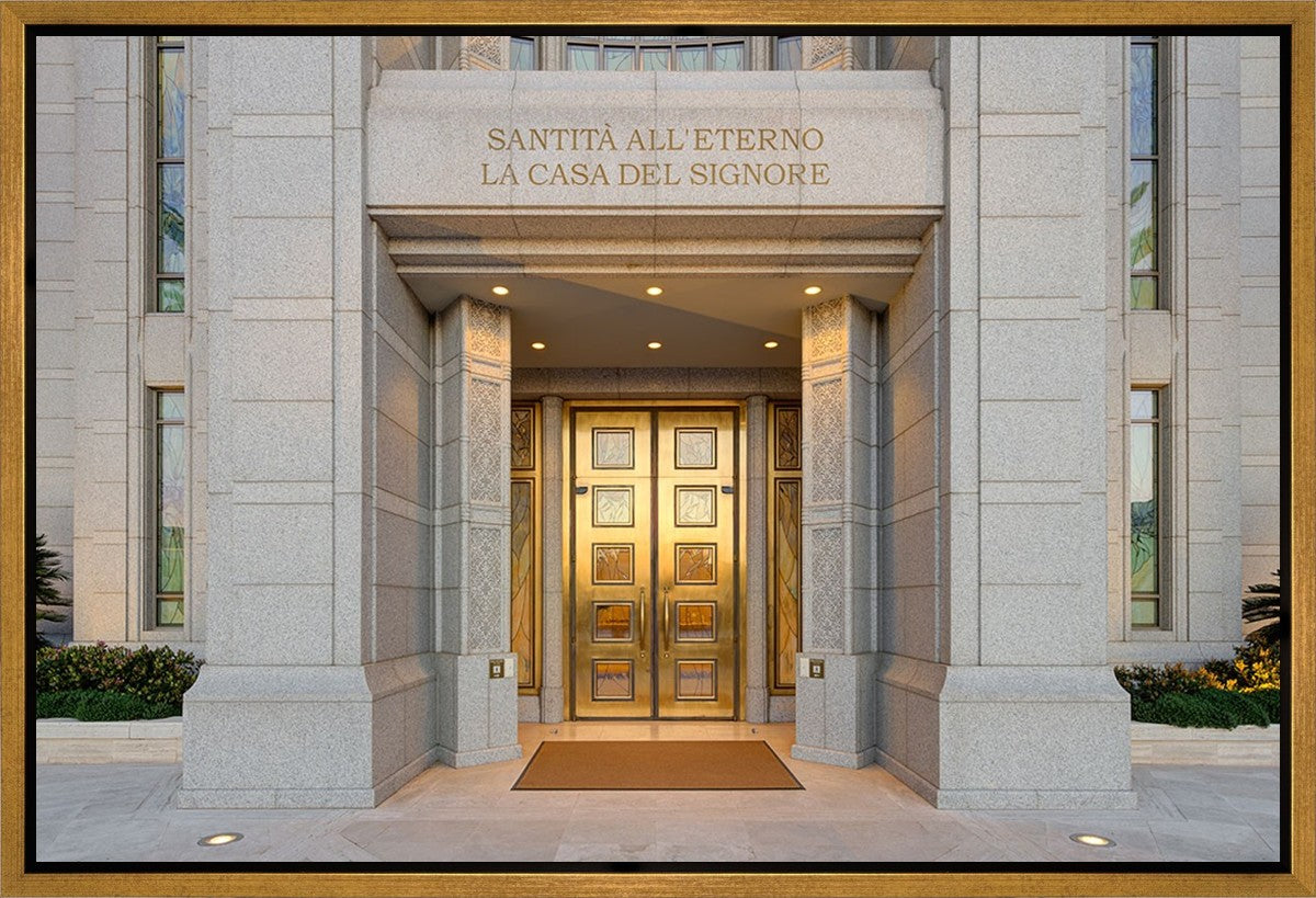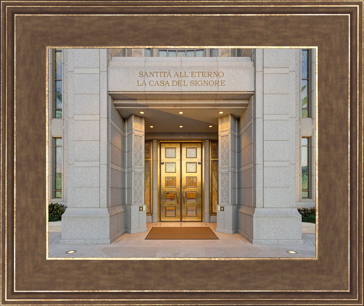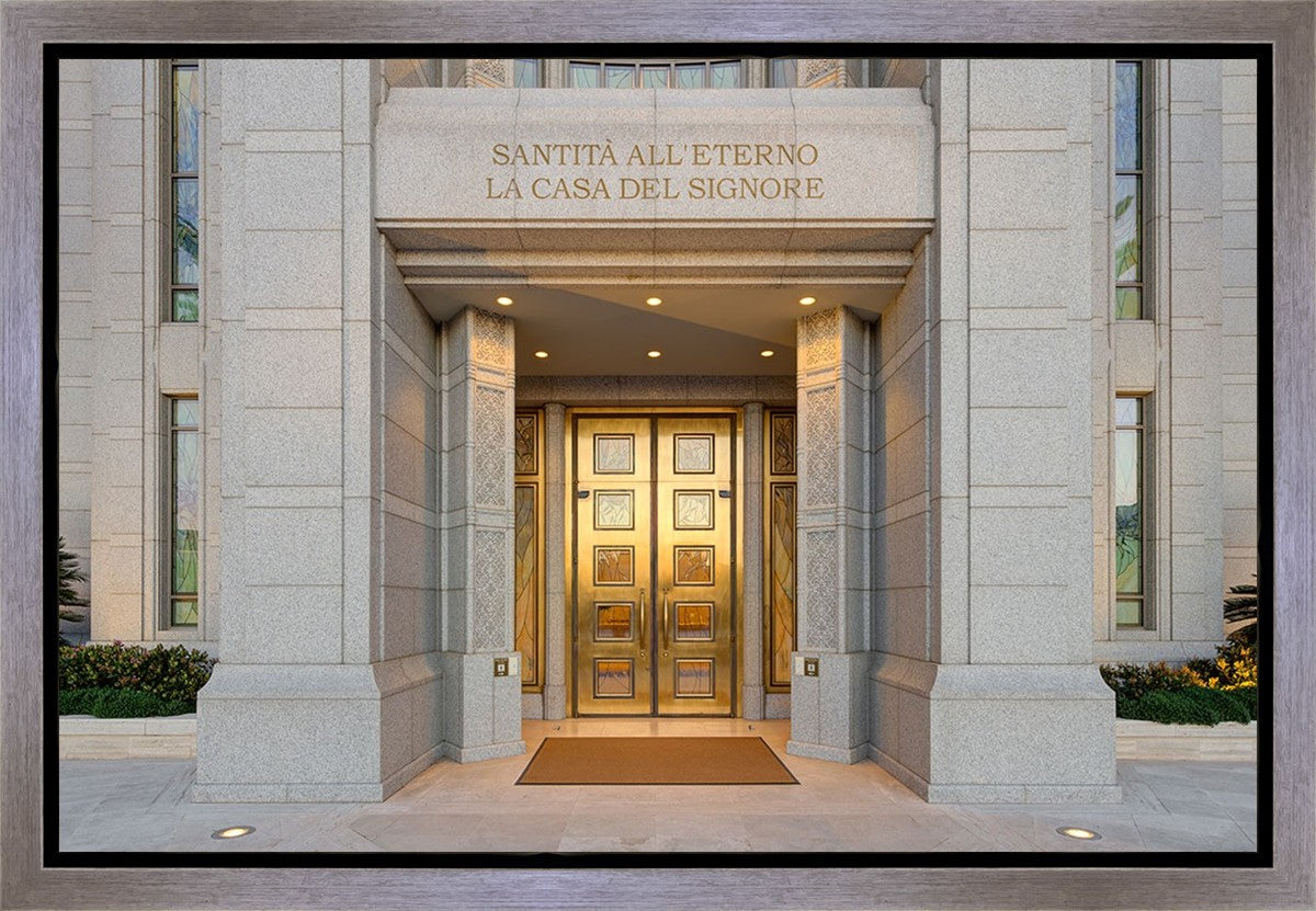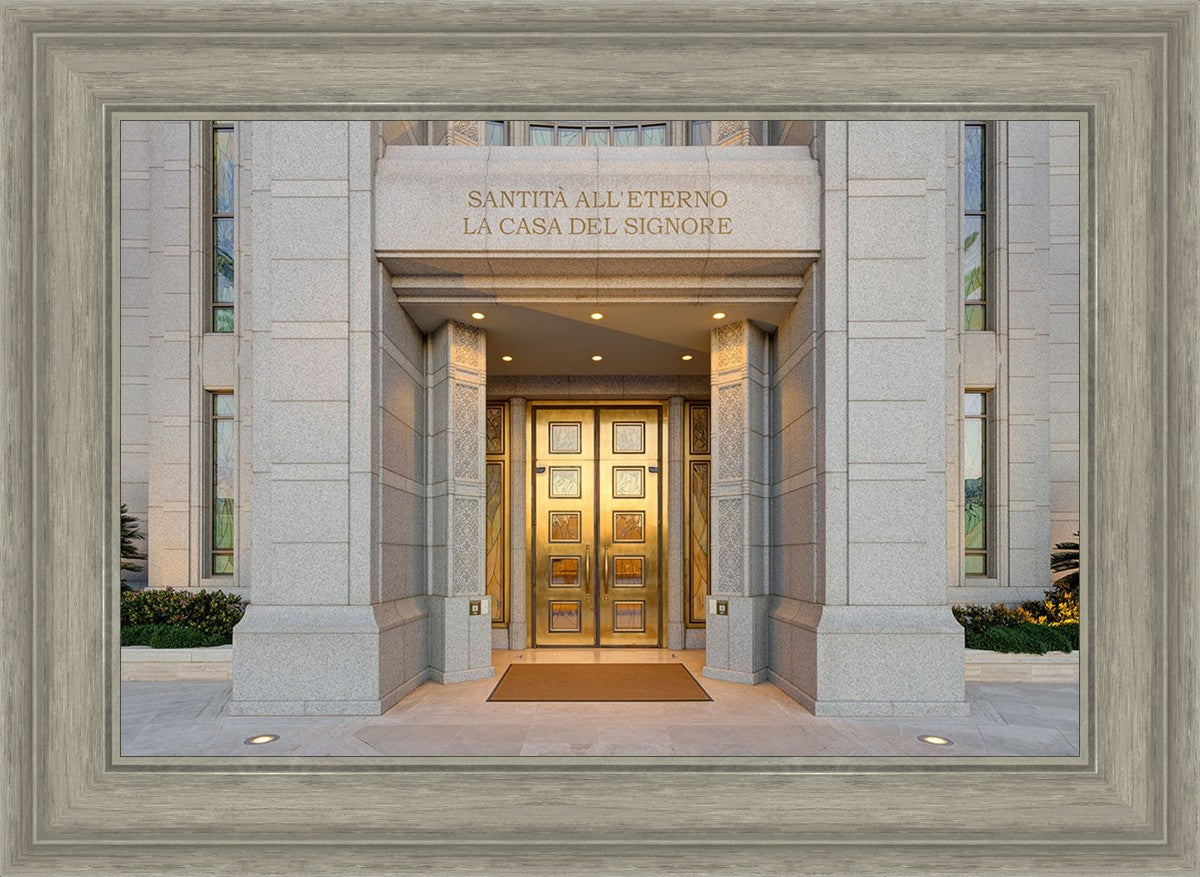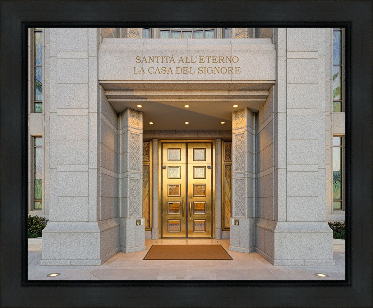 The entrance to the Rome Temple with the inscription above "Santita all'eterno la casa del signore"