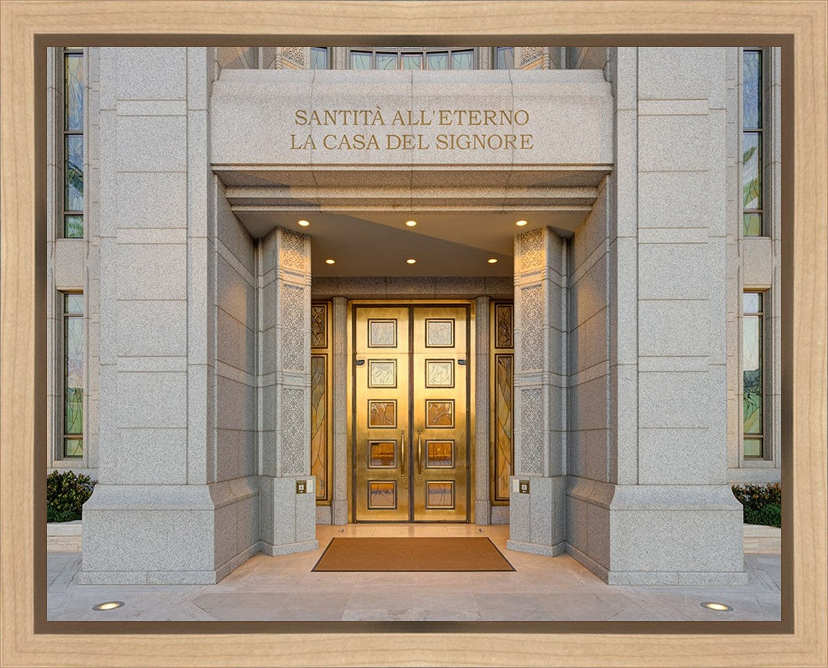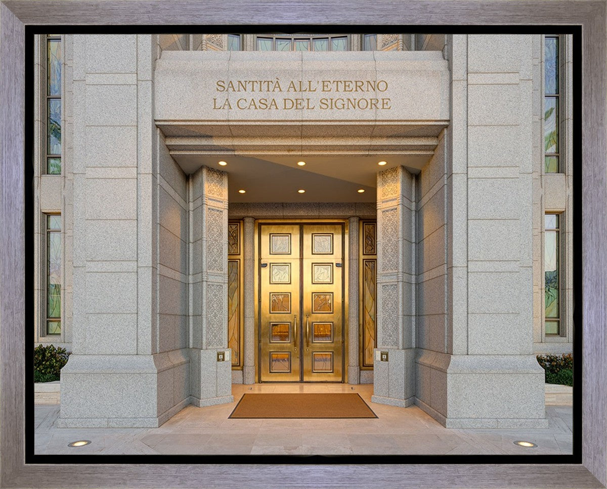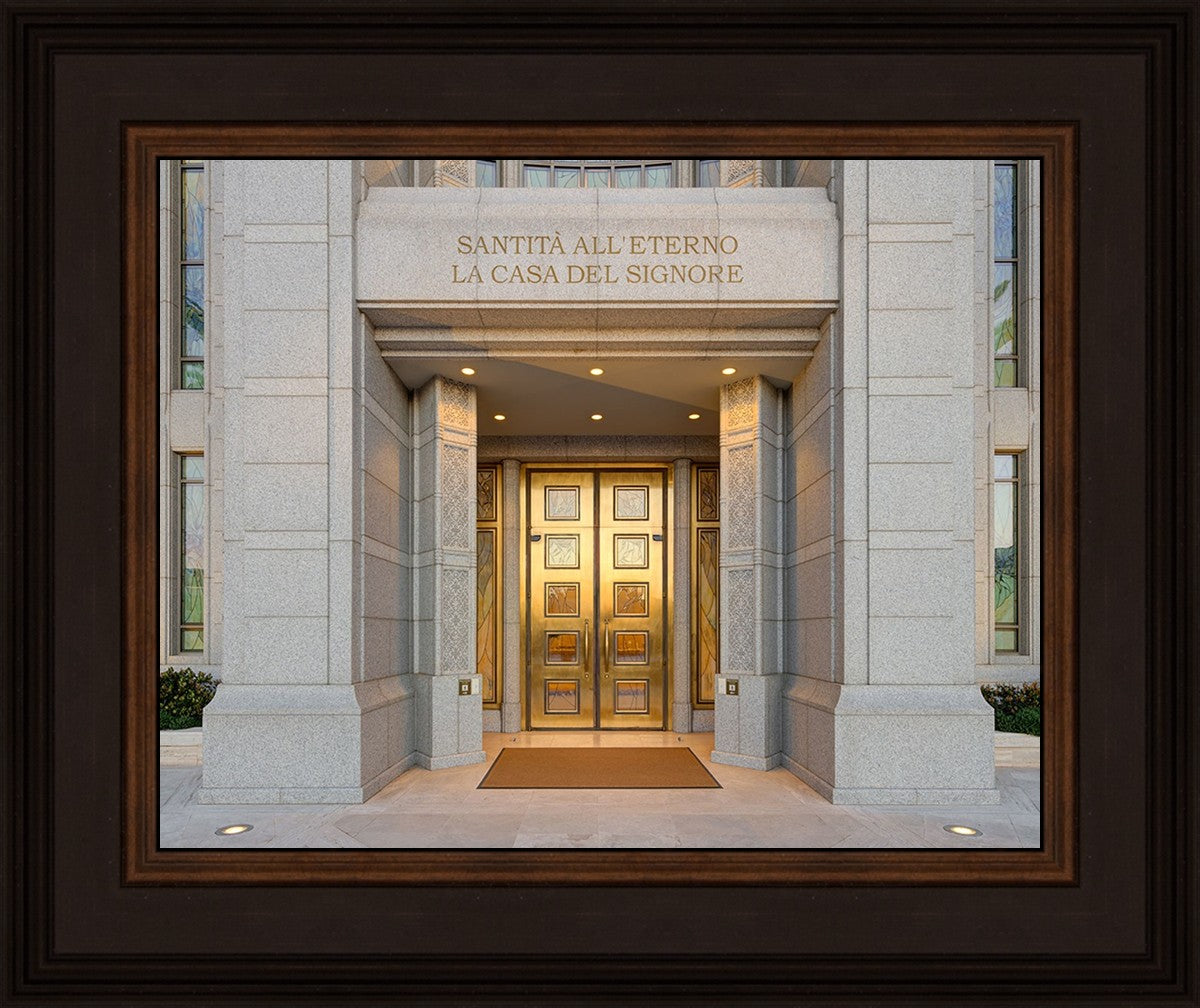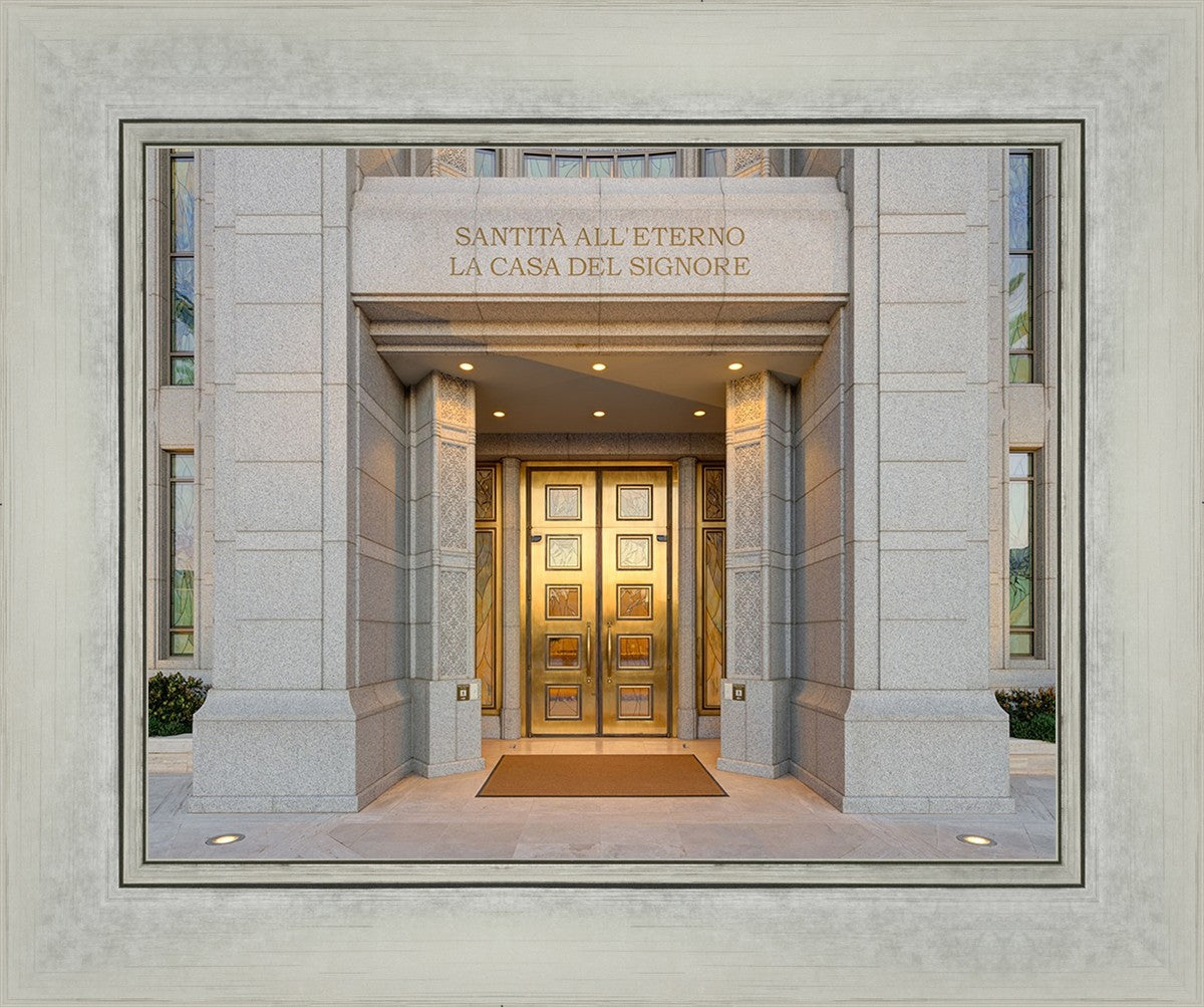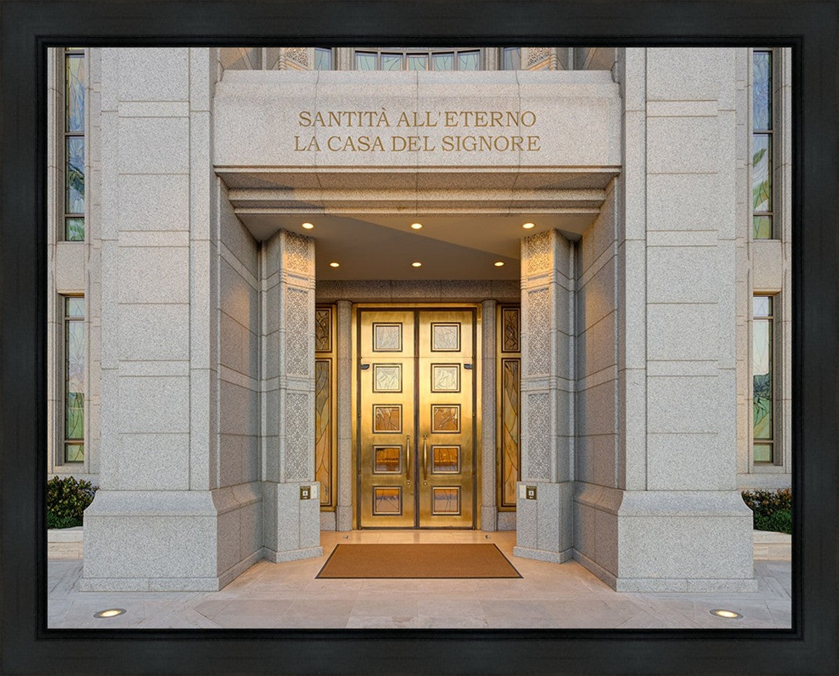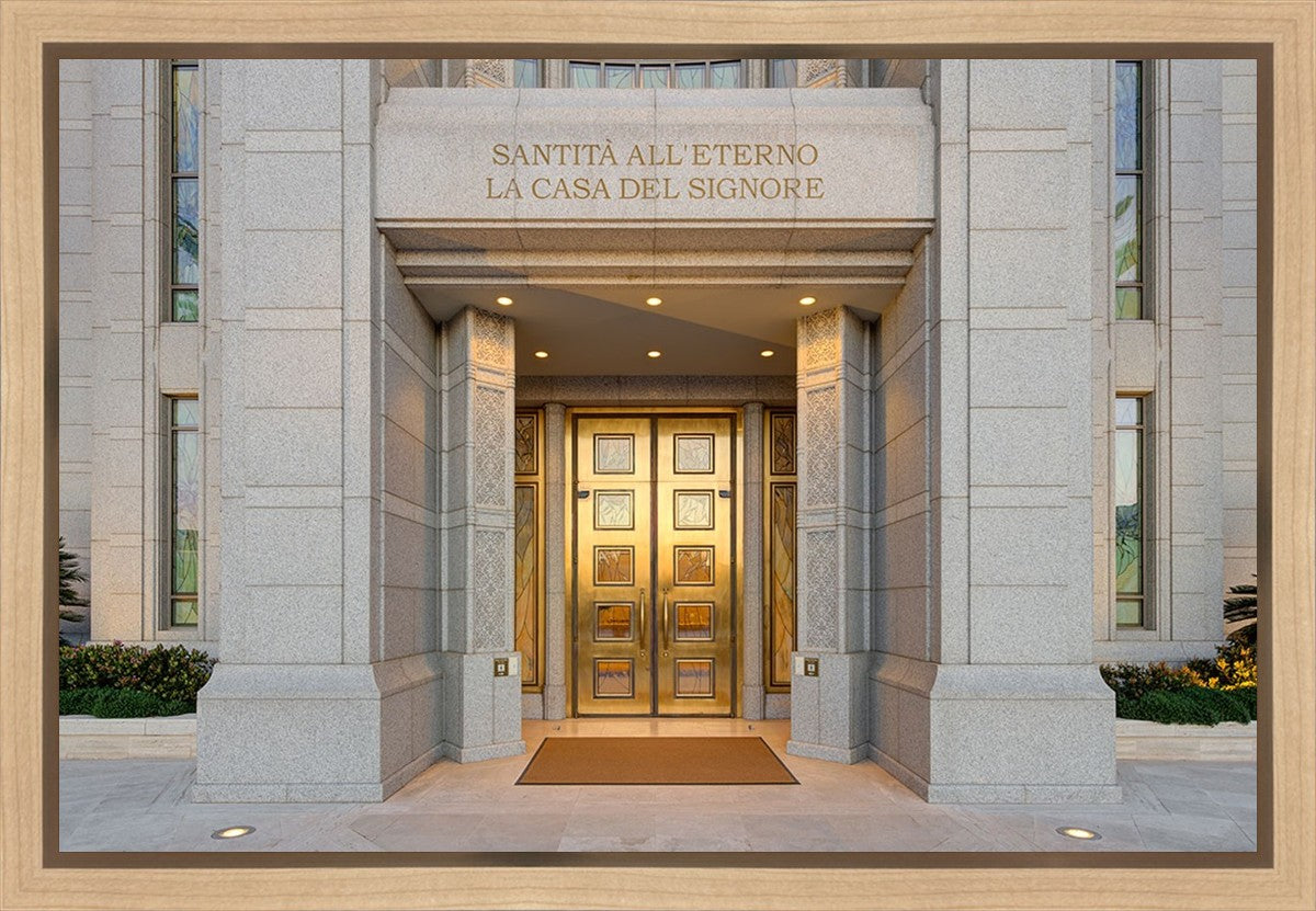 The entrance to the Rome Temple with the inscription above "Santita all'eterno la casa del signore"