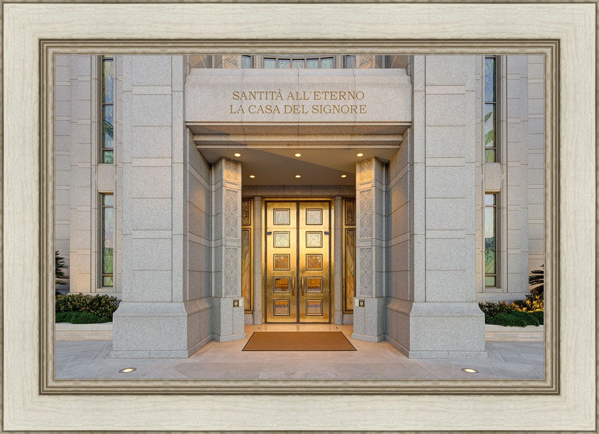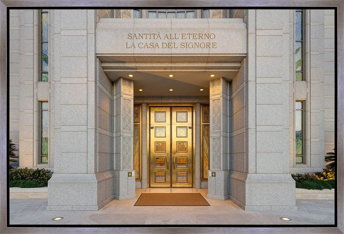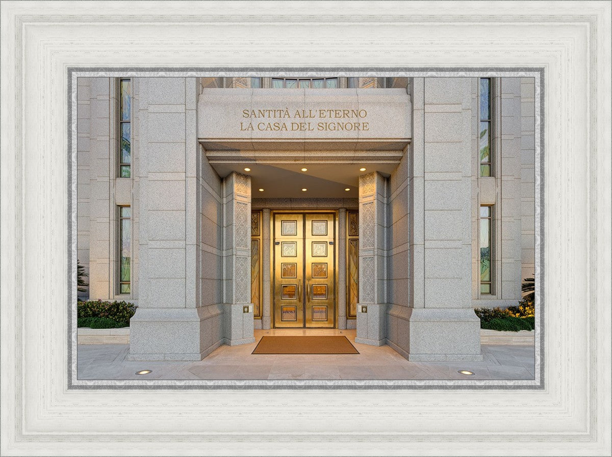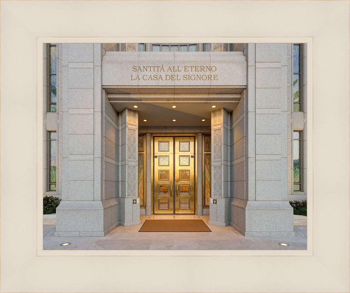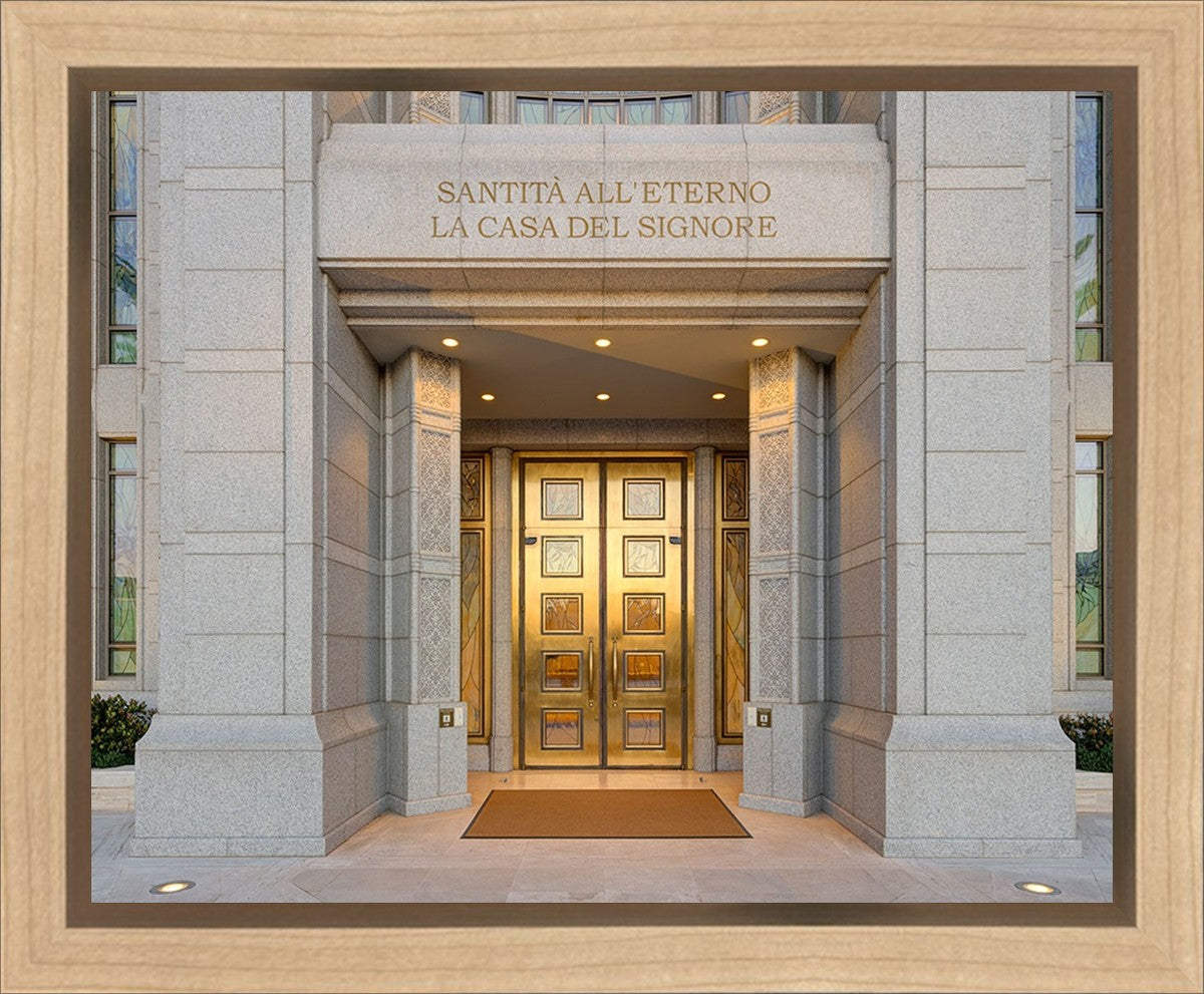 The entrance to the Rome Temple with the inscription above "Santita all'eterno la casa del signore"
