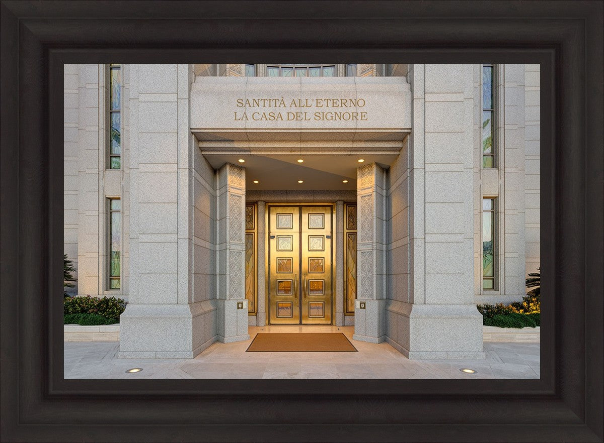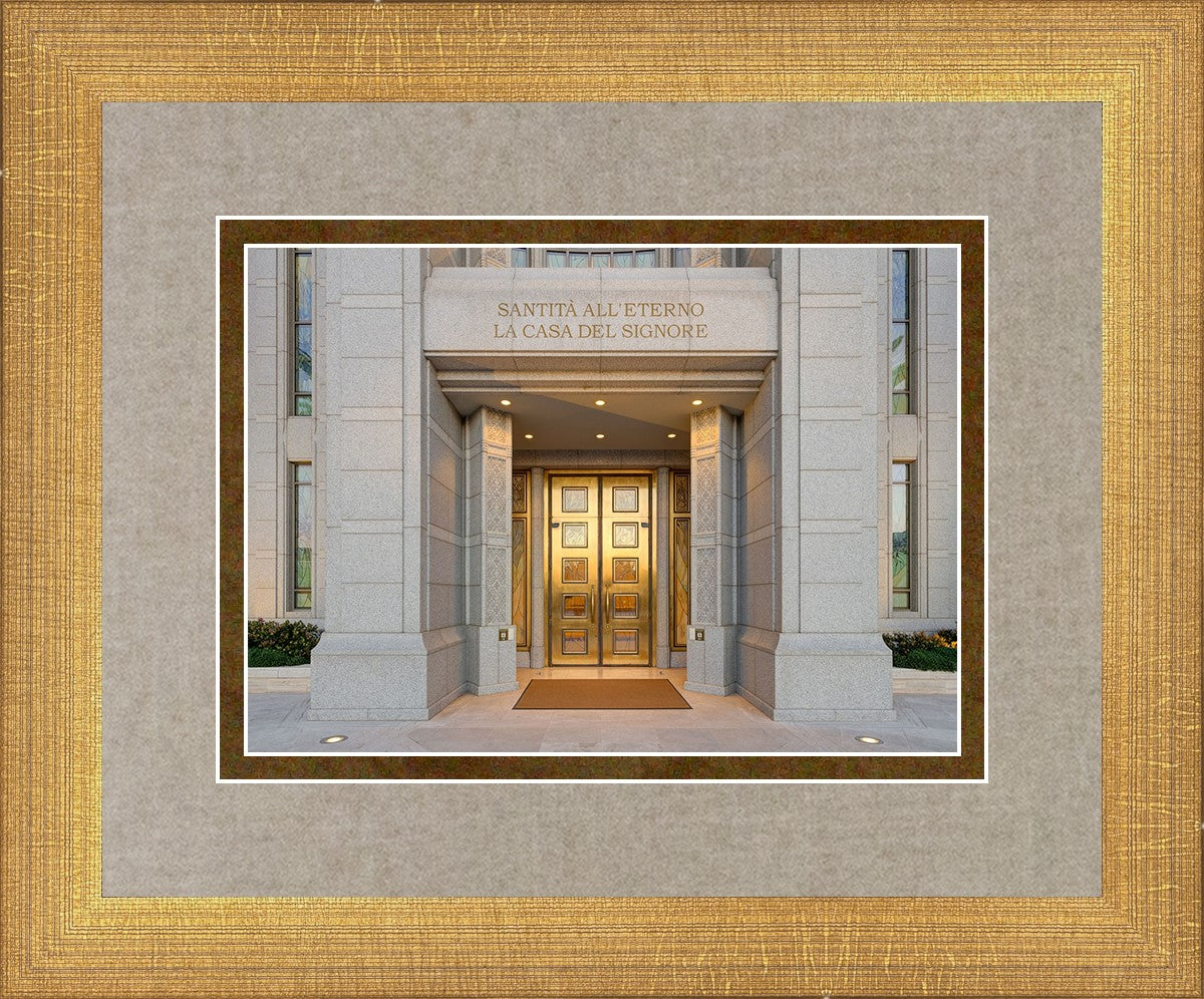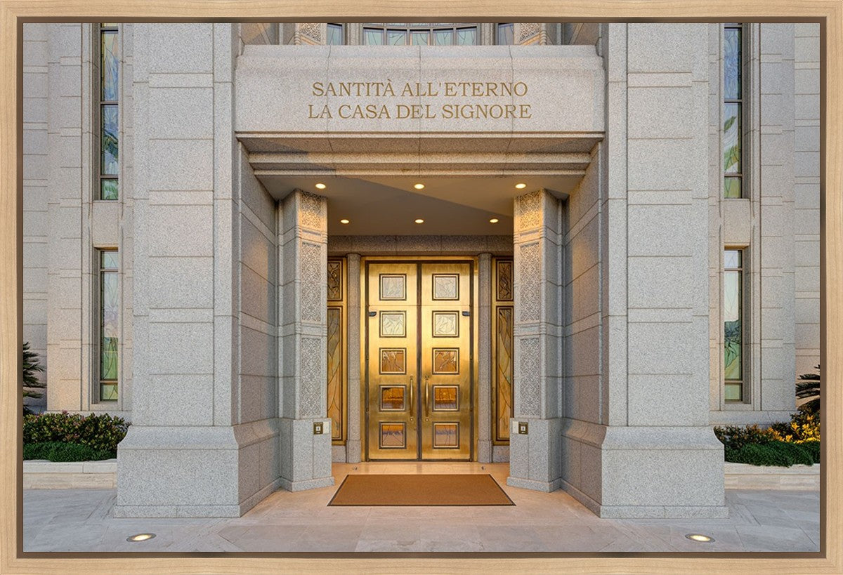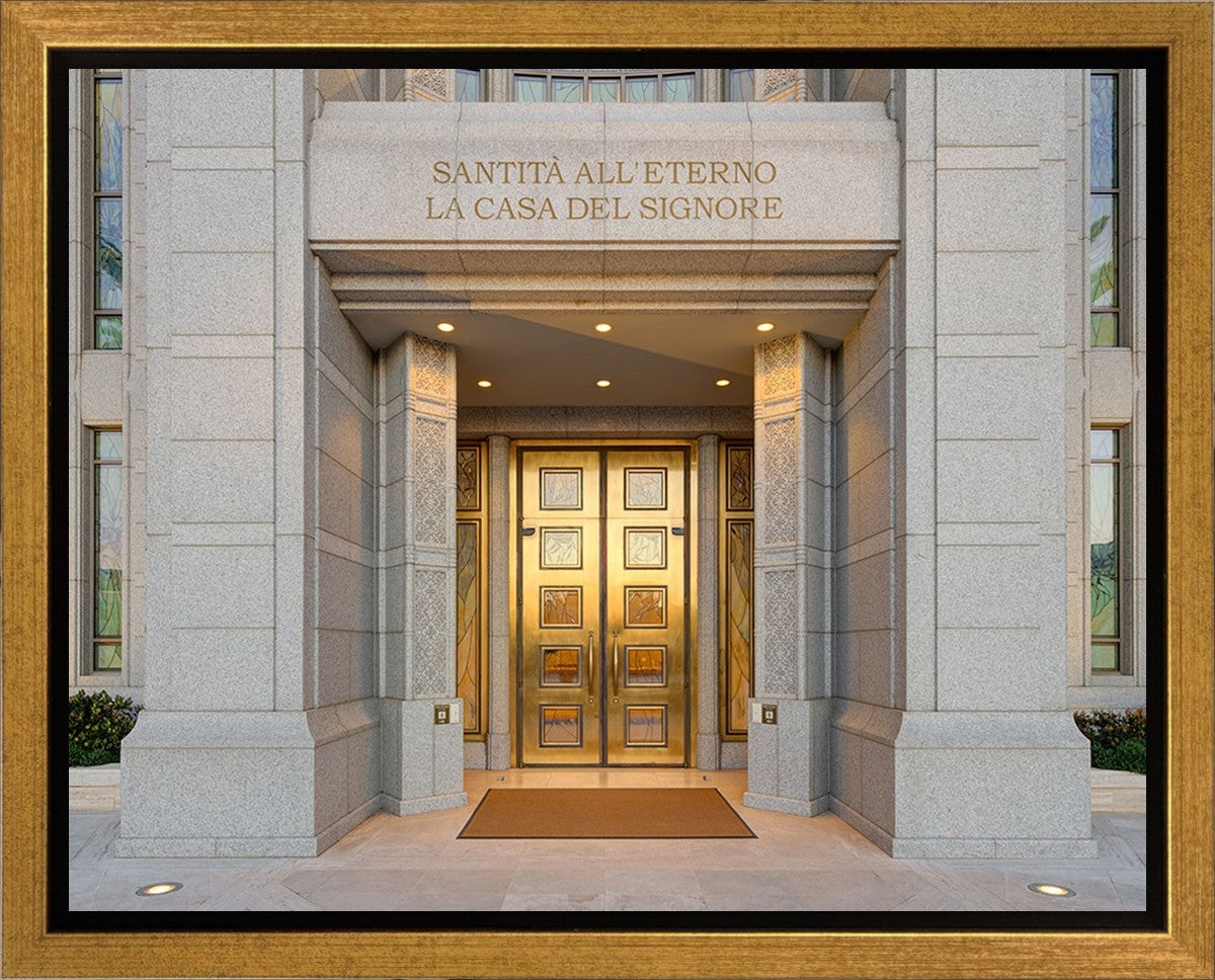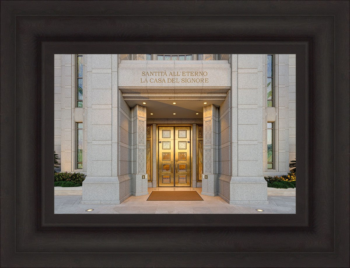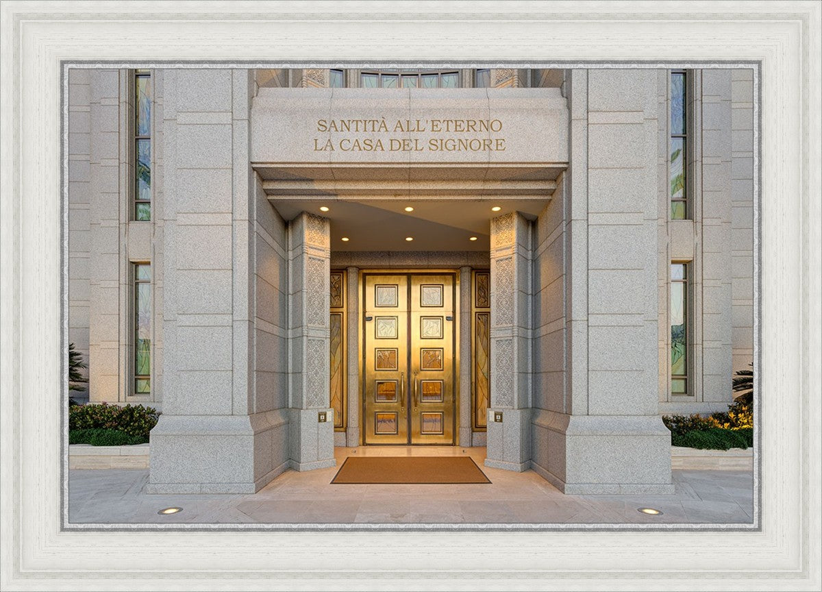 The entrance to the Rome Temple with the inscription above "Santita all'eterno la casa del signore"