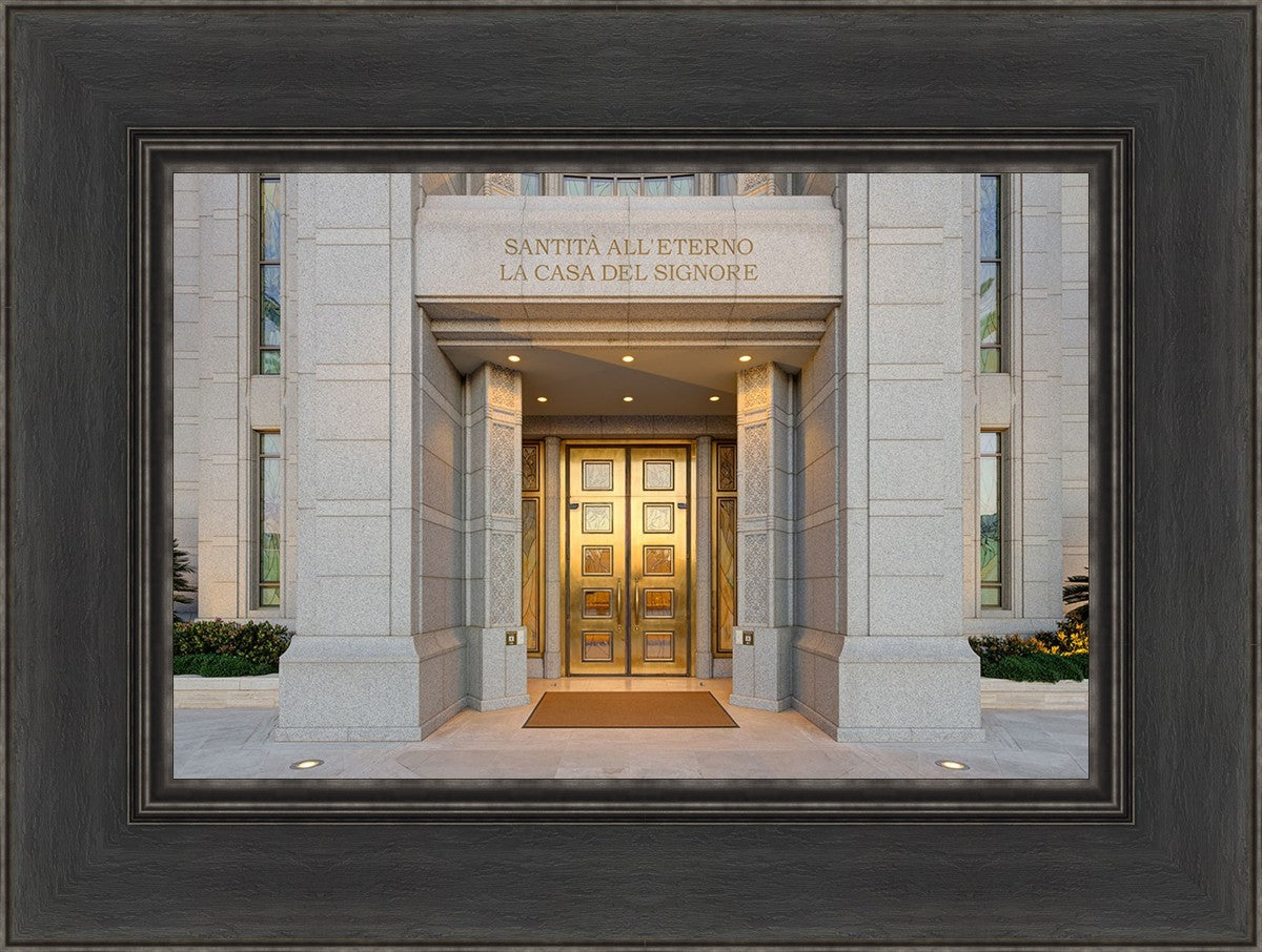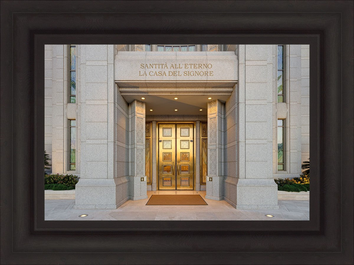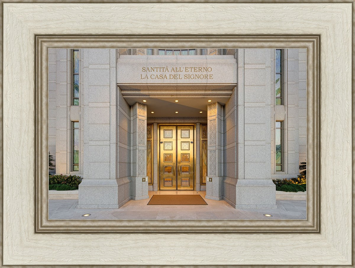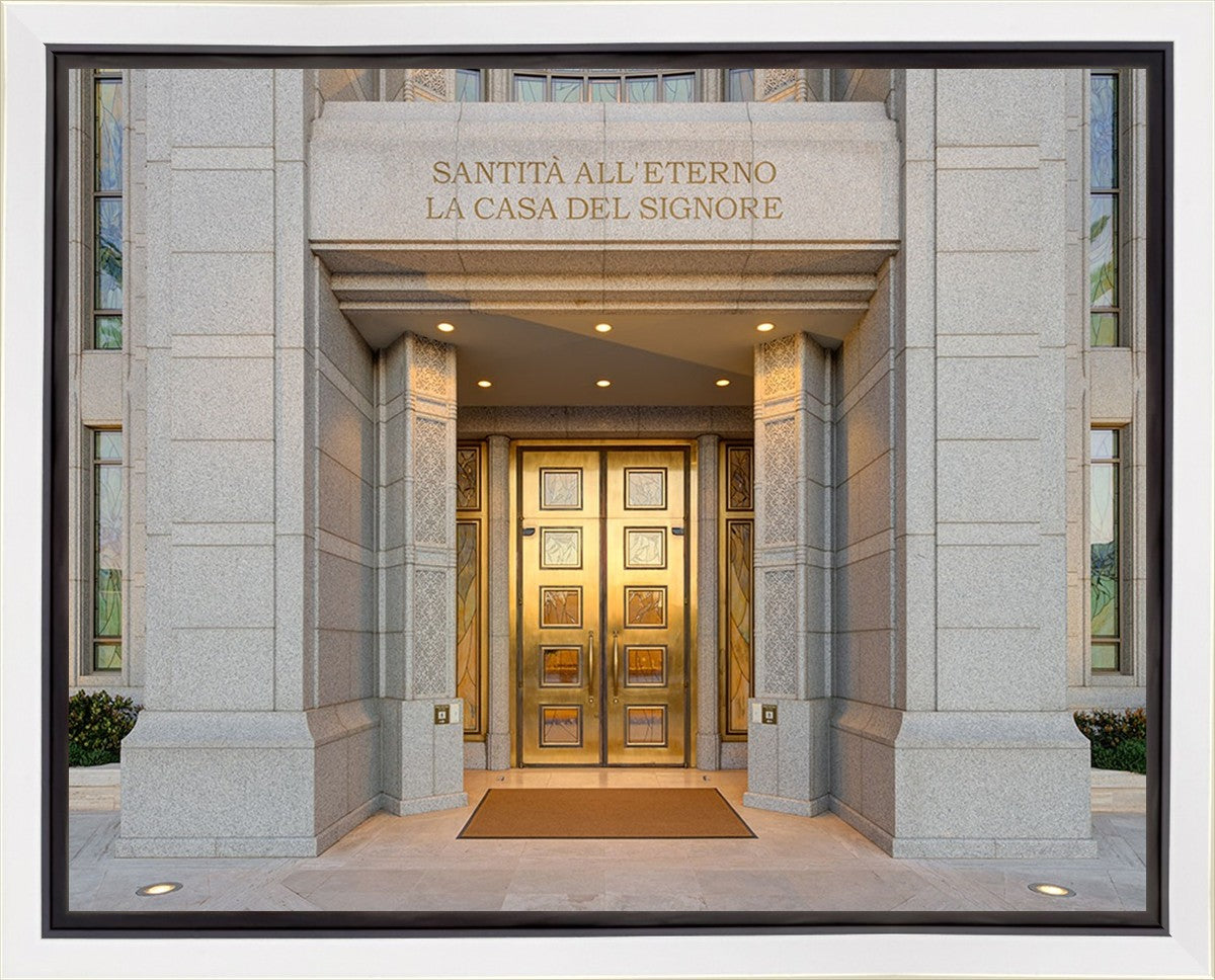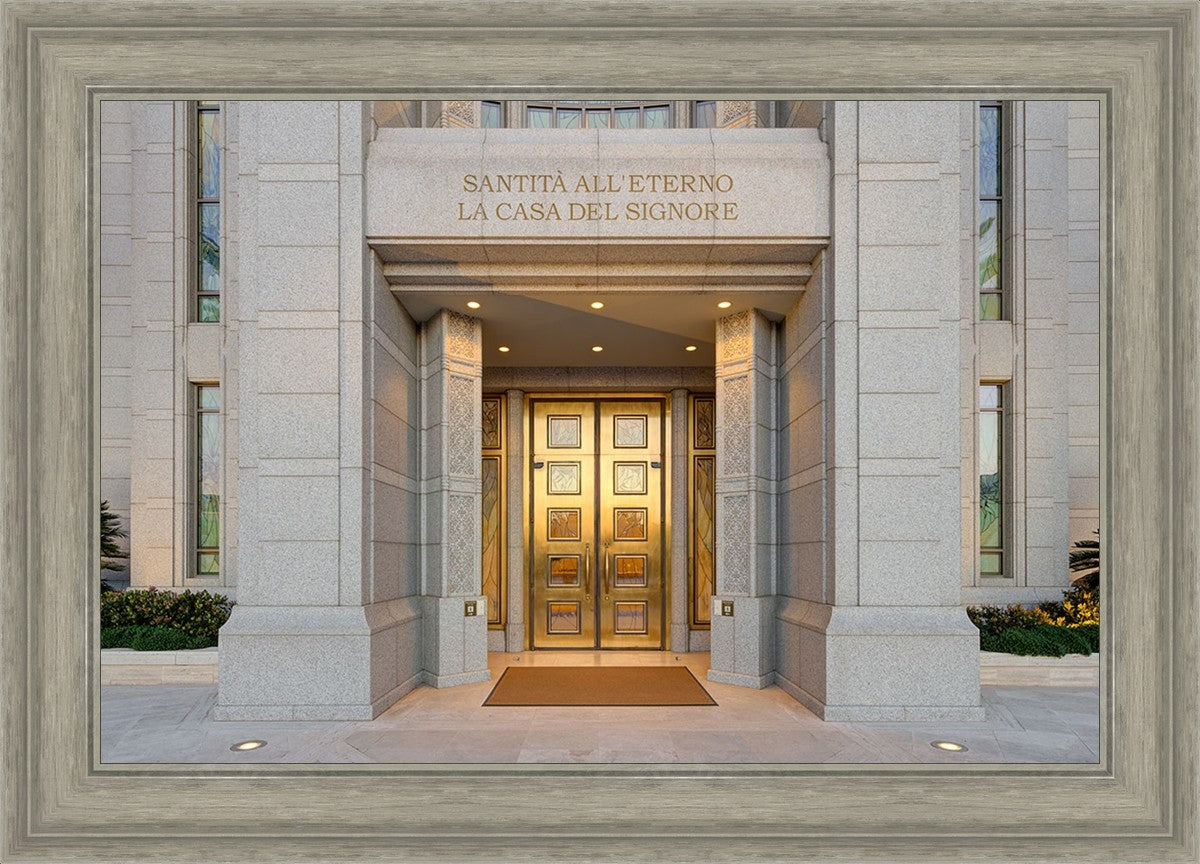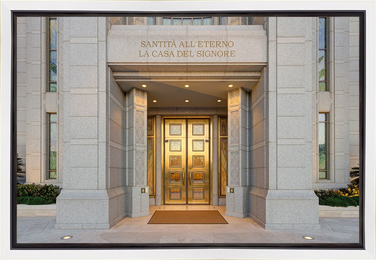 The entrance to the Rome Temple with the inscription above "Santita all'eterno la casa del signore"