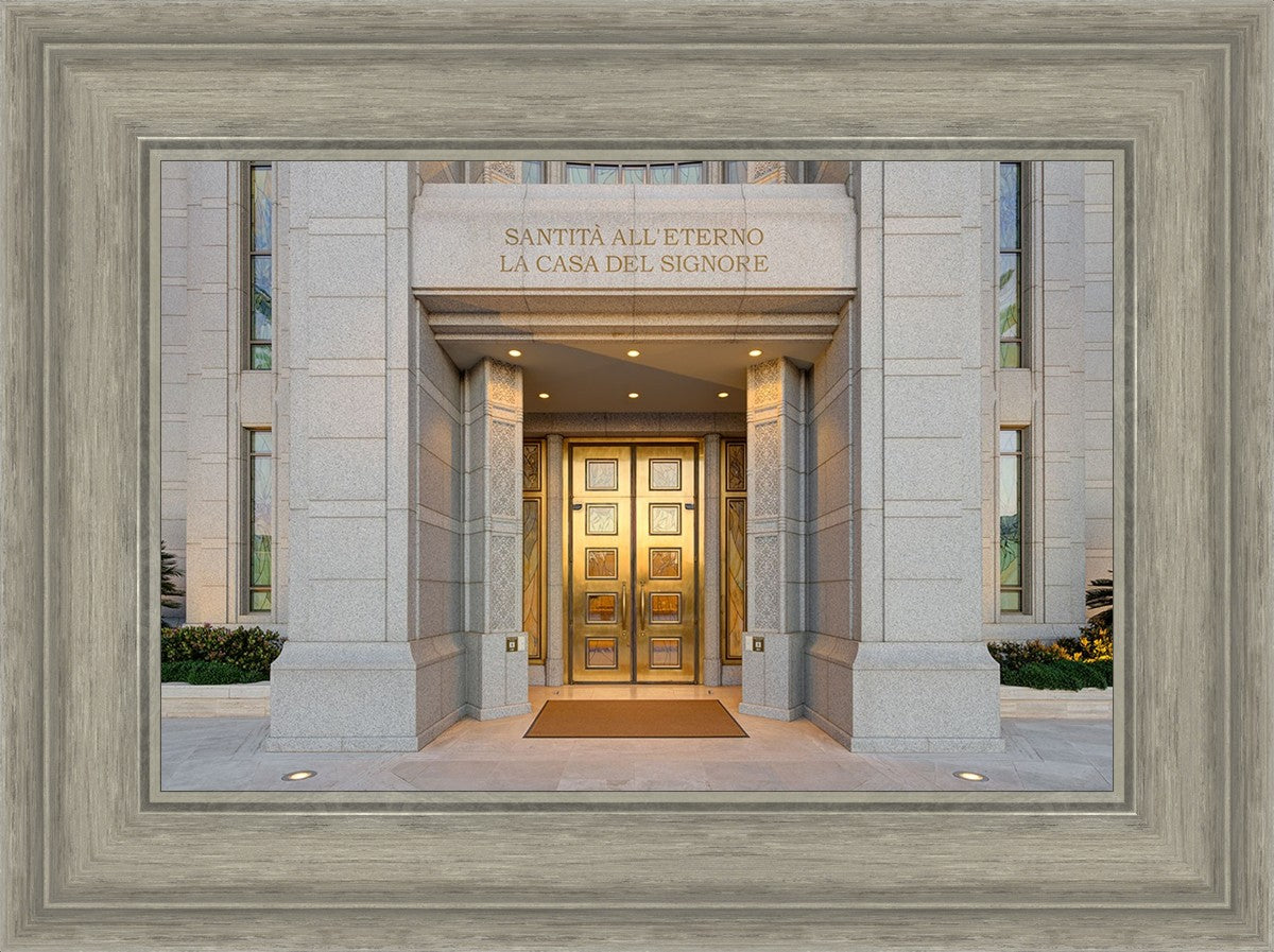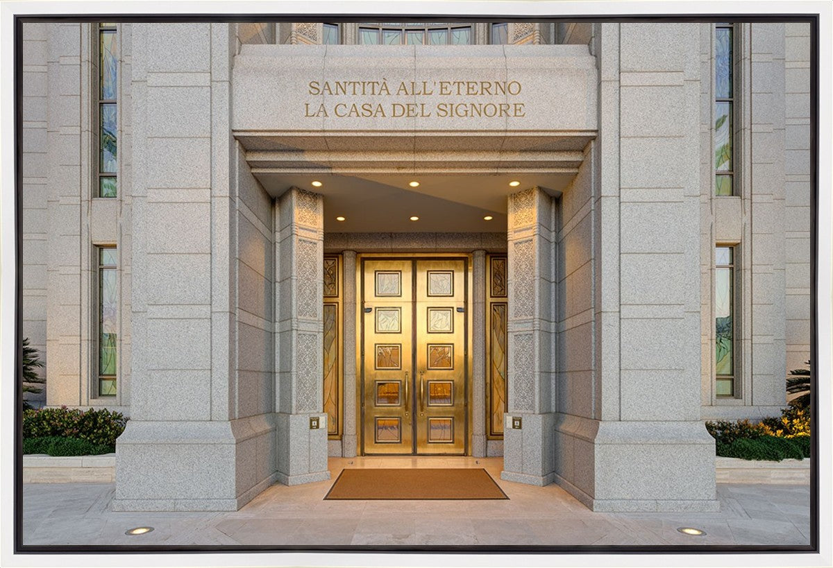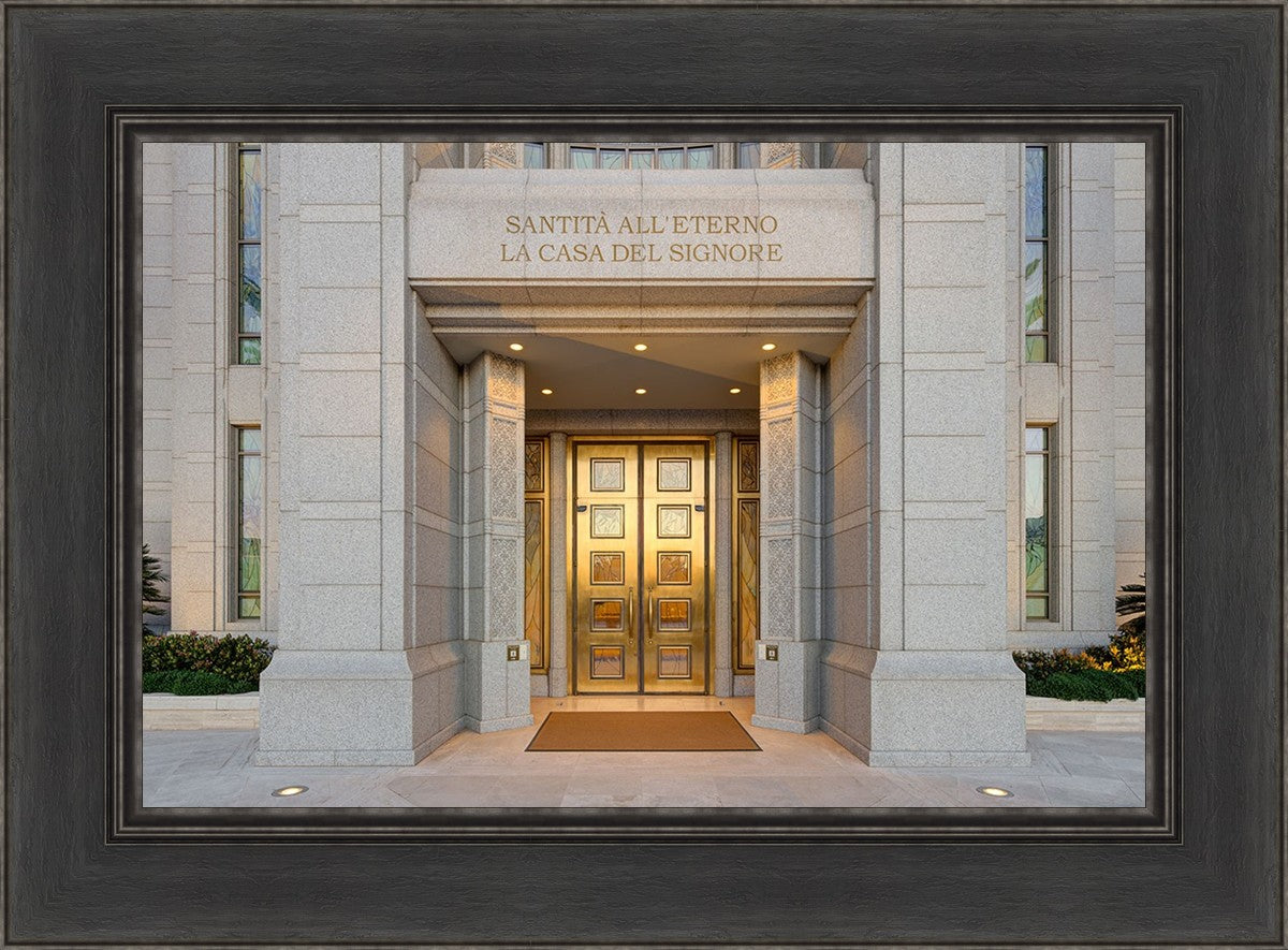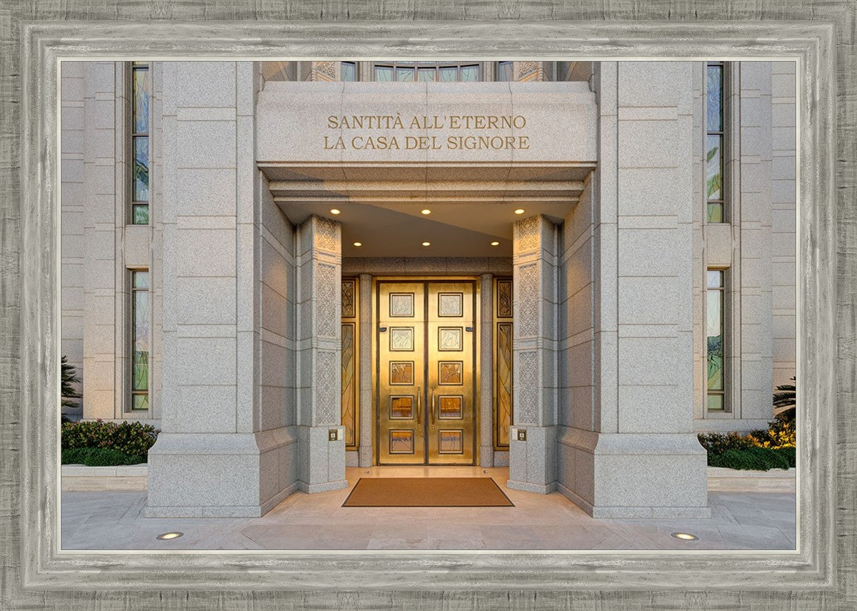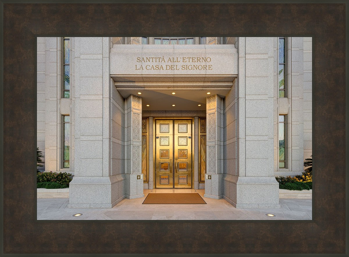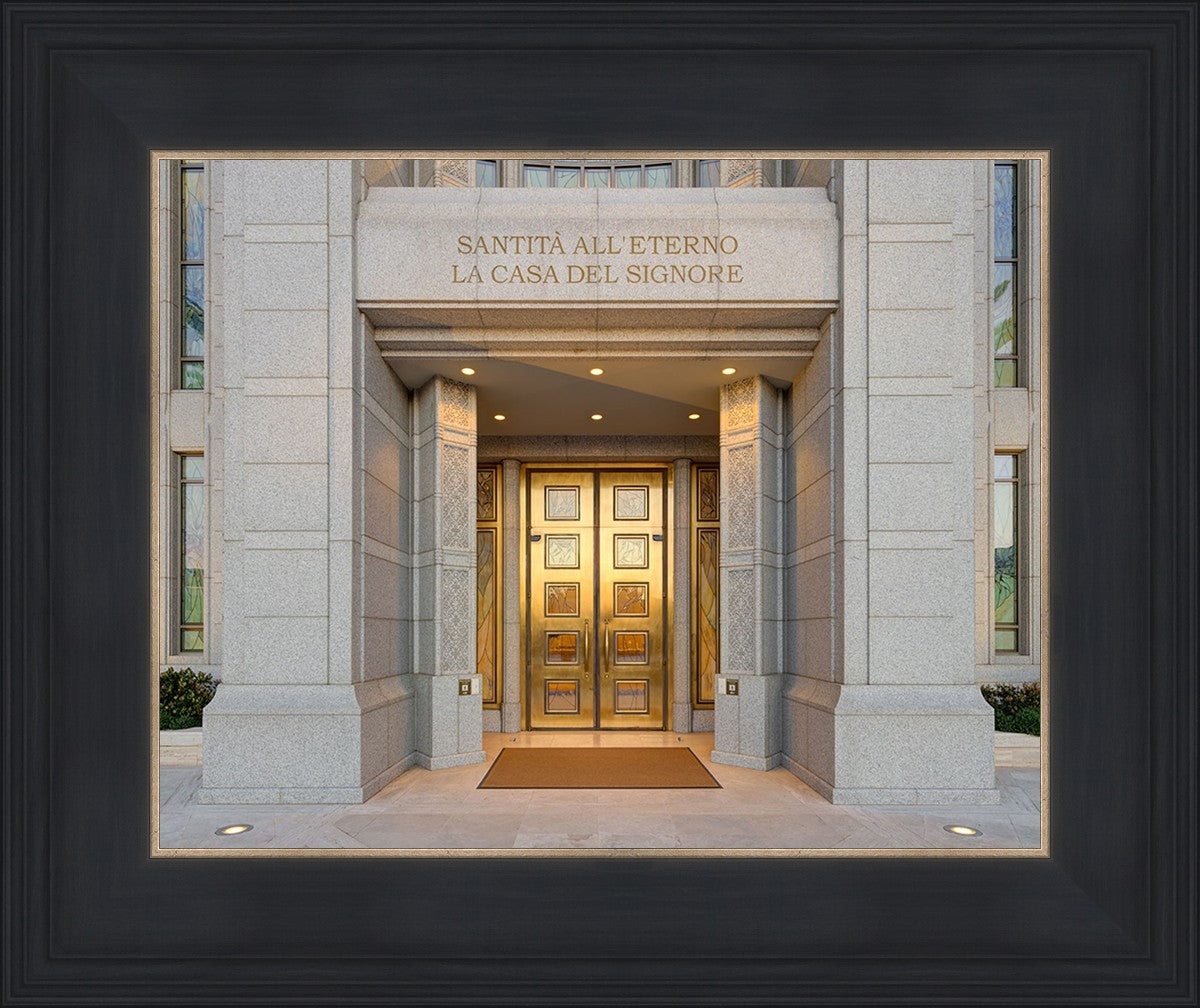 The entrance to the Rome Temple with the inscription above "Santita all'eterno la casa del signore"