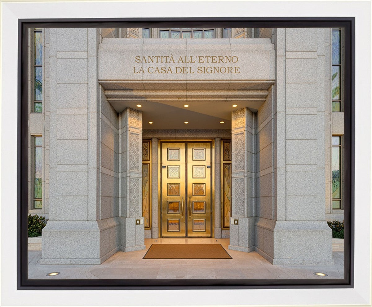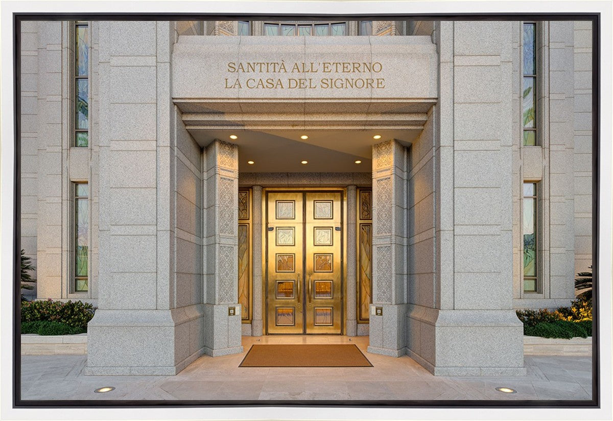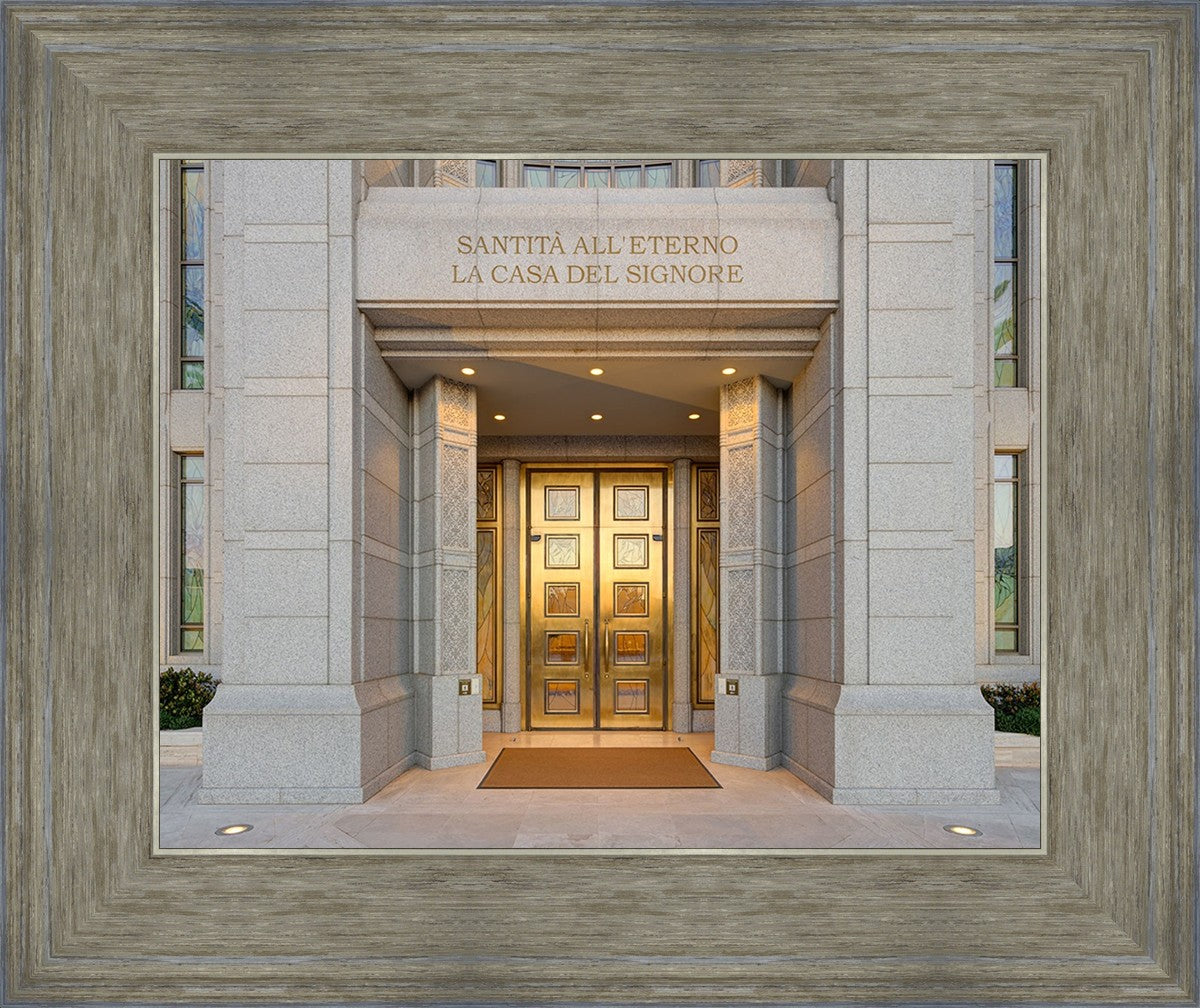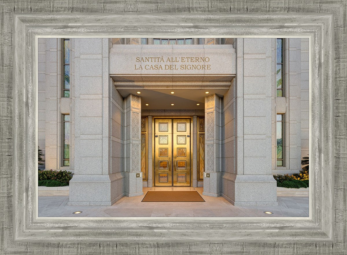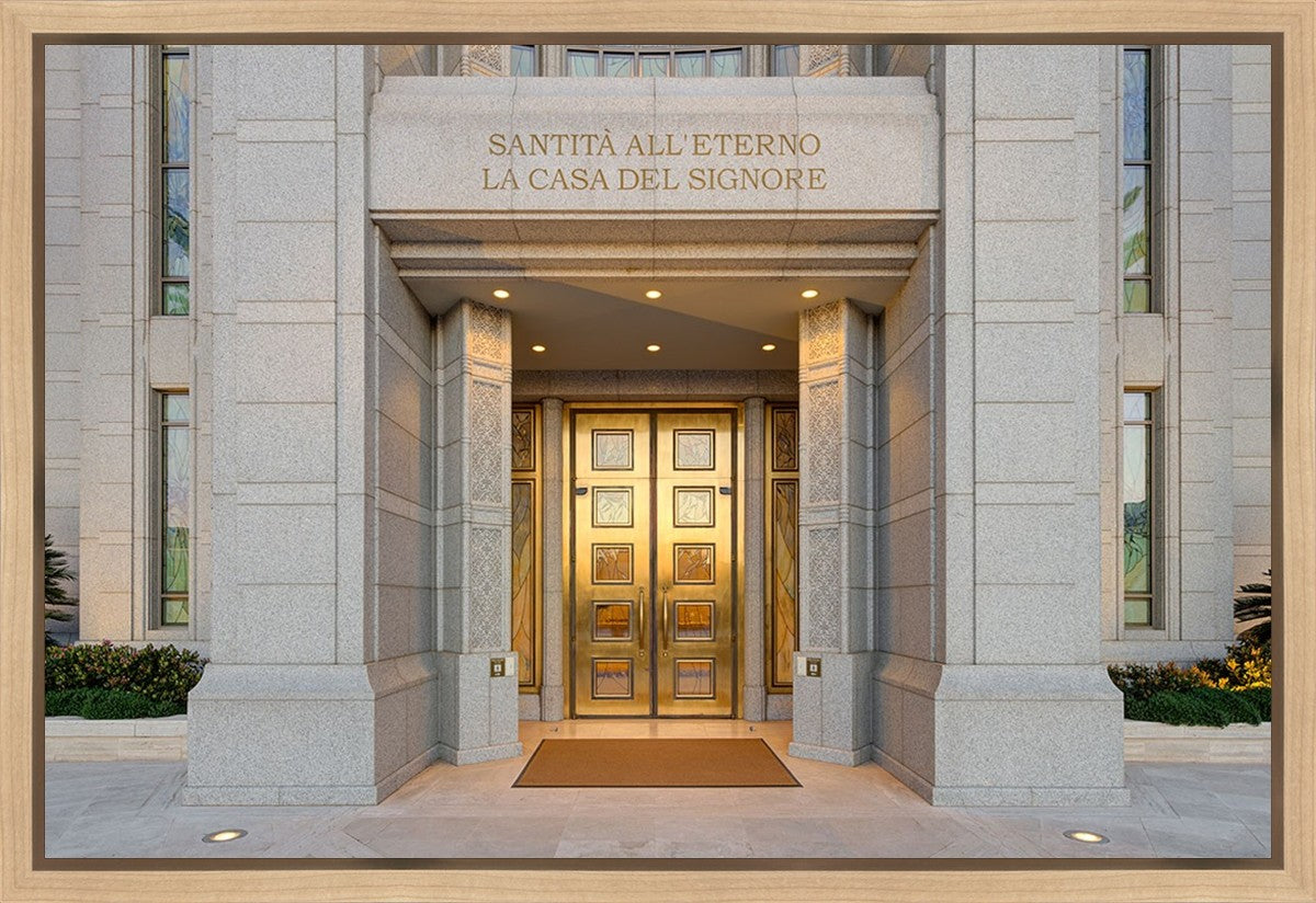The entrance to the Rome Temple with the inscription above "Santita all'eterno la casa del signore"