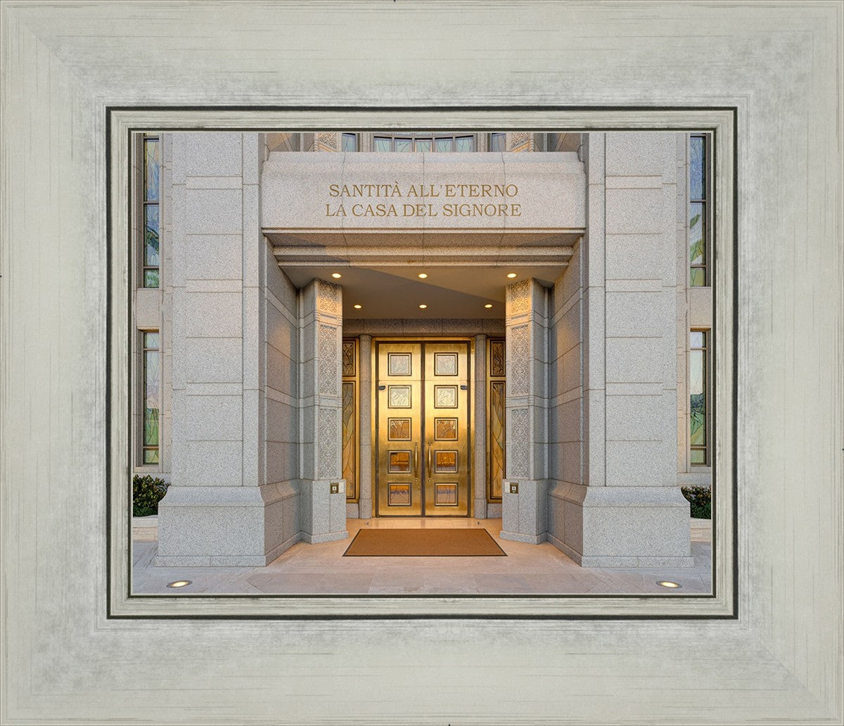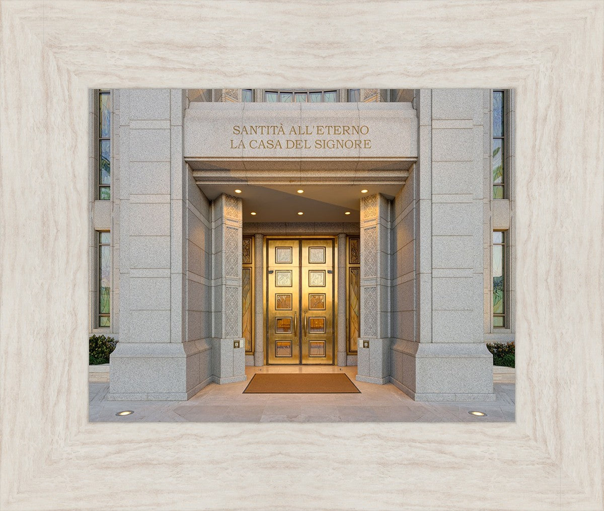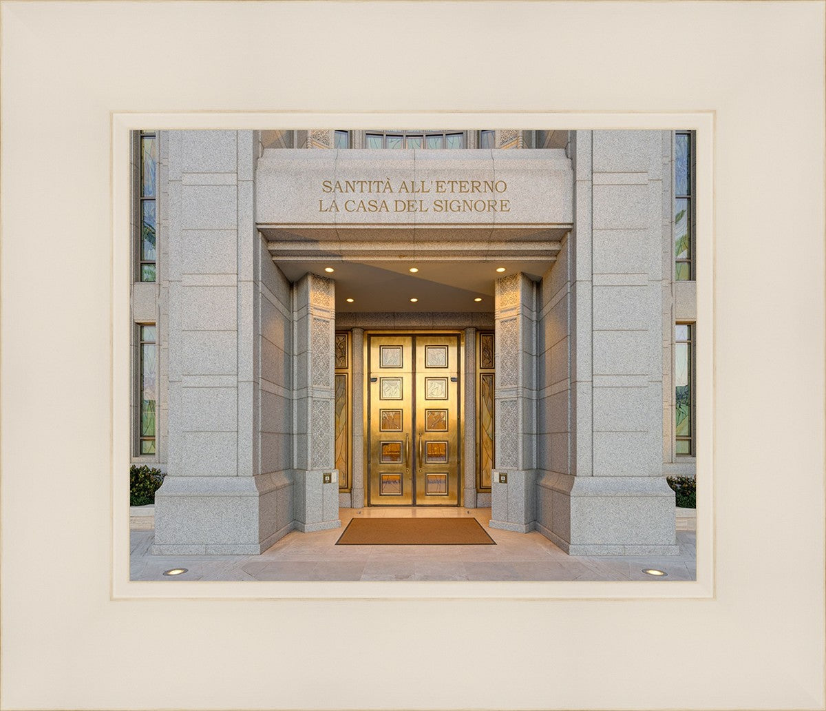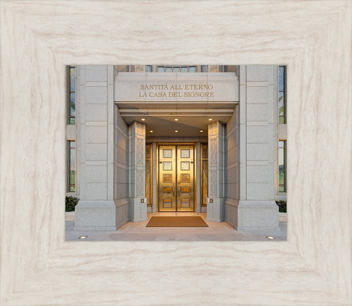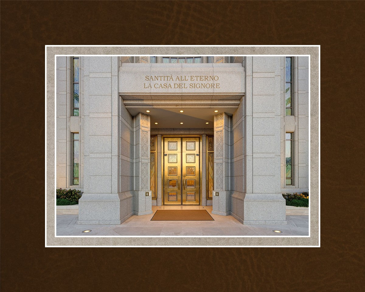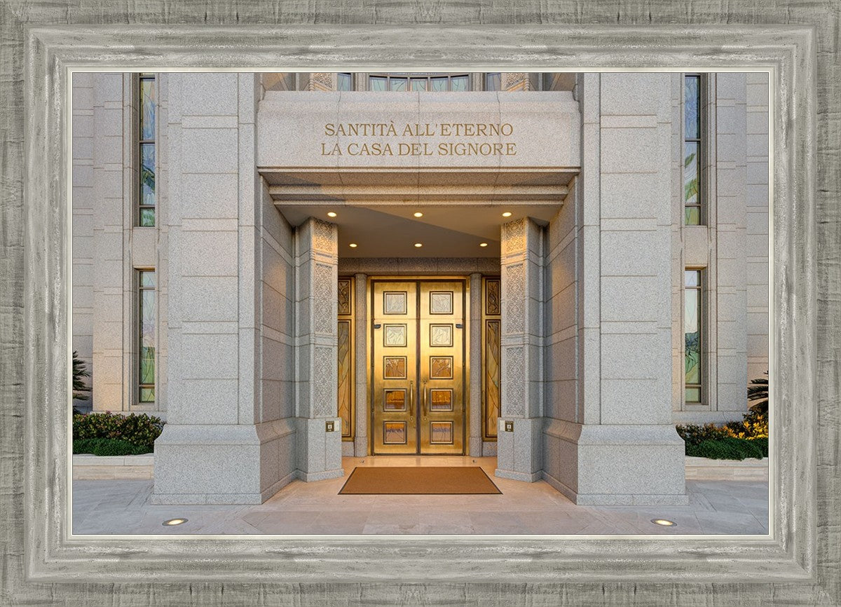 The entrance to the Rome Temple with the inscription above "Santita all'eterno la casa del signore"