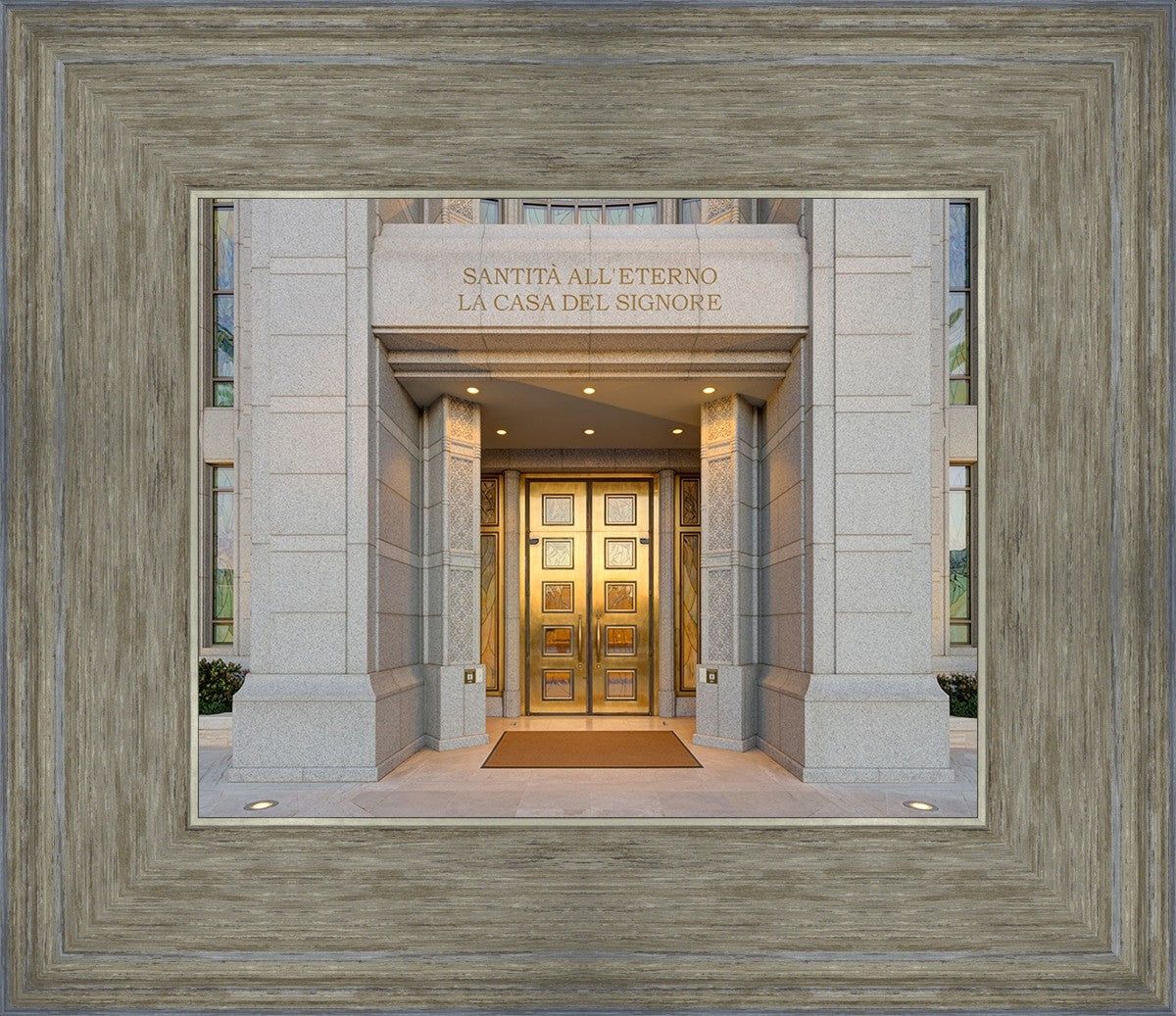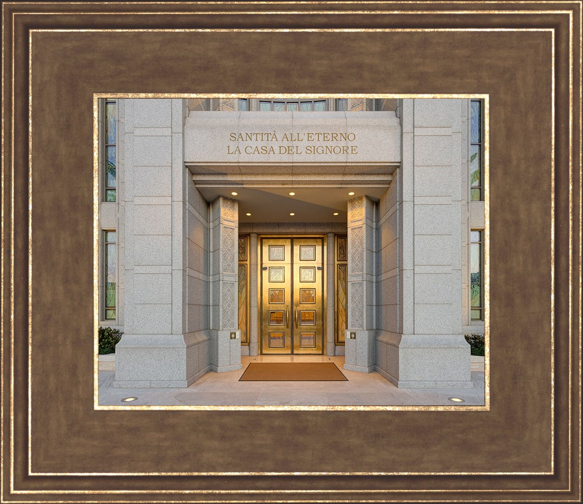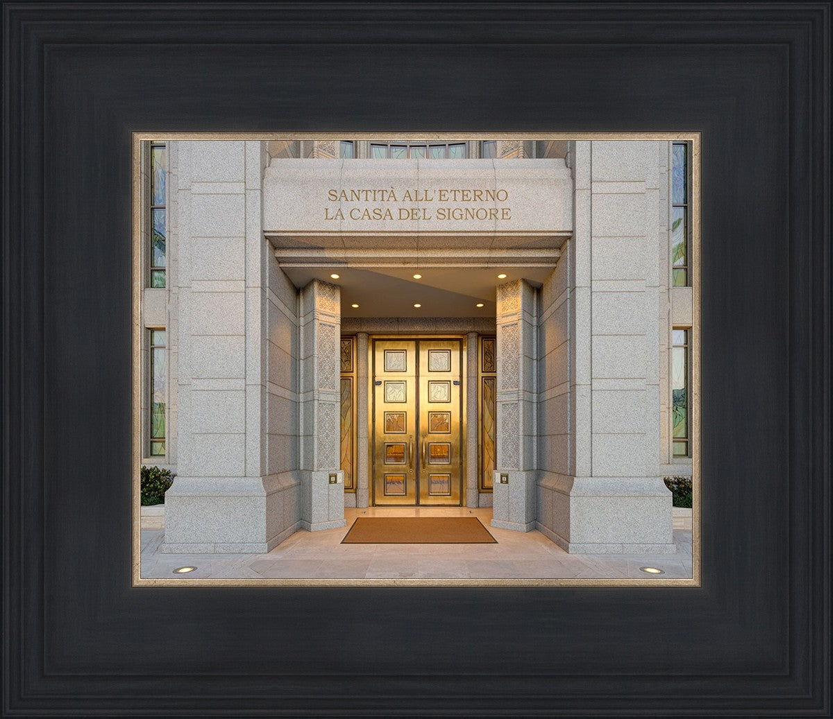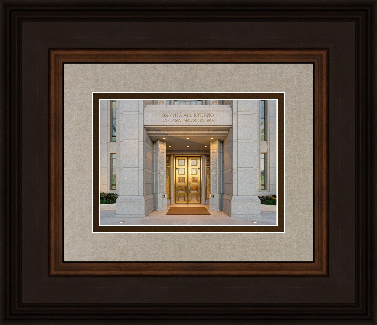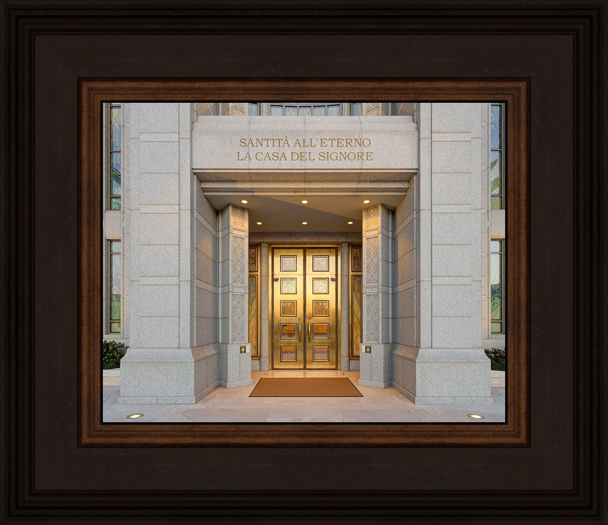 The entrance to the Rome Temple with the inscription above "Santita all'eterno la casa del signore"