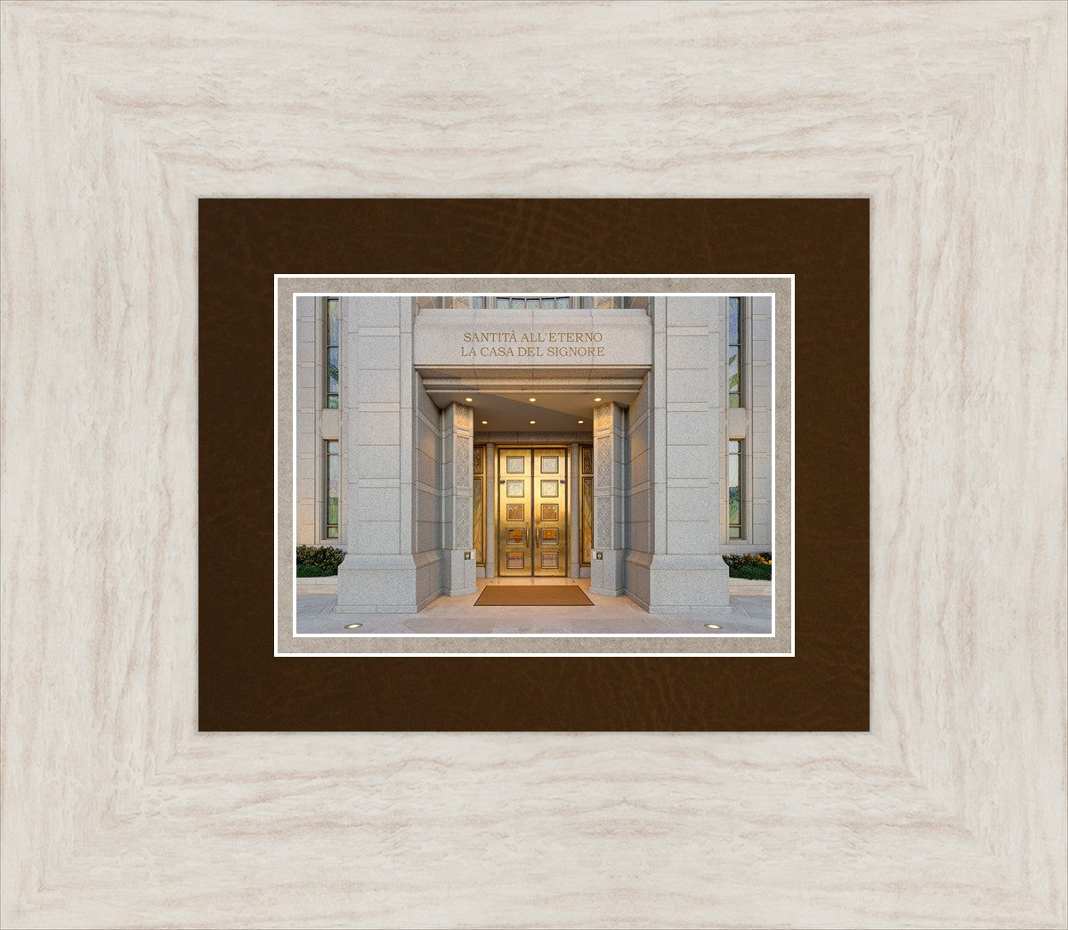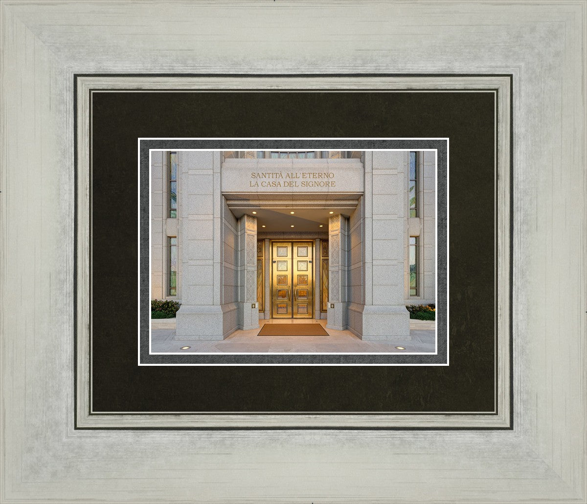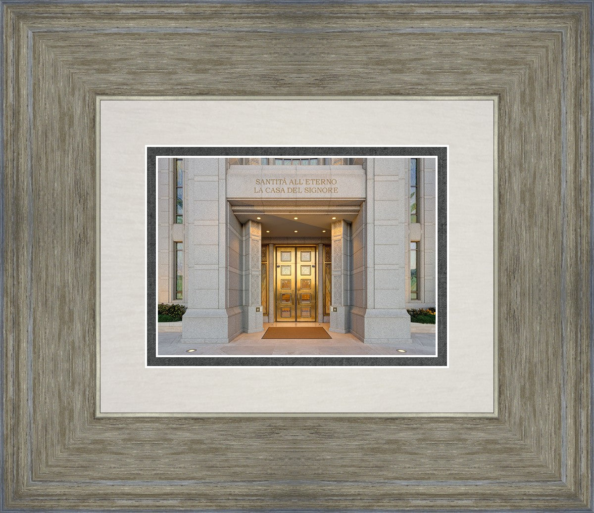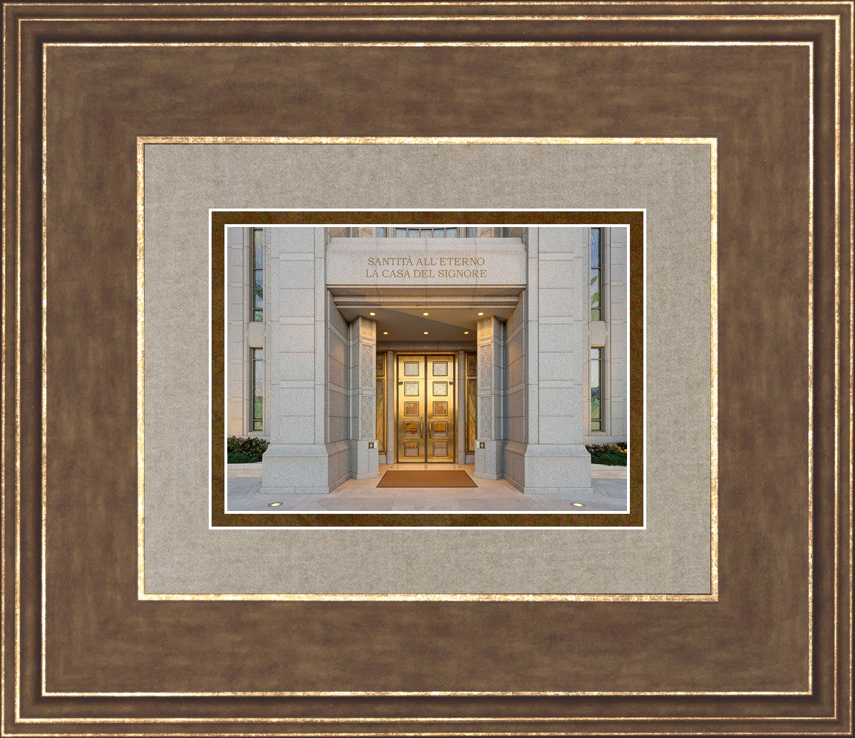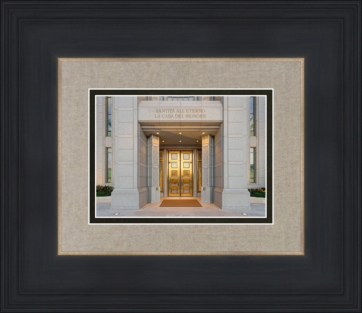 The entrance to the Rome Temple with the inscription above "Santita all'eterno la casa del signore"