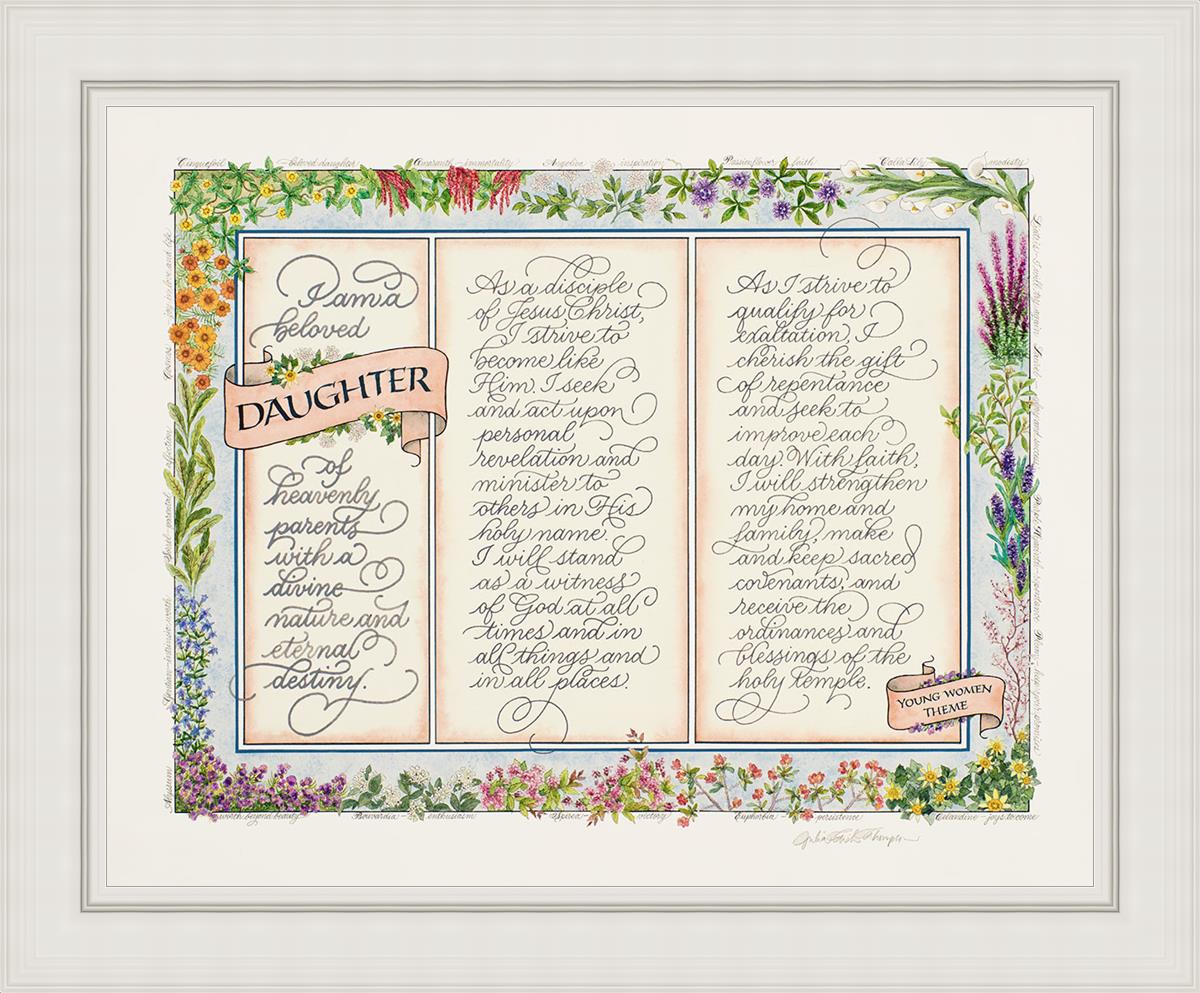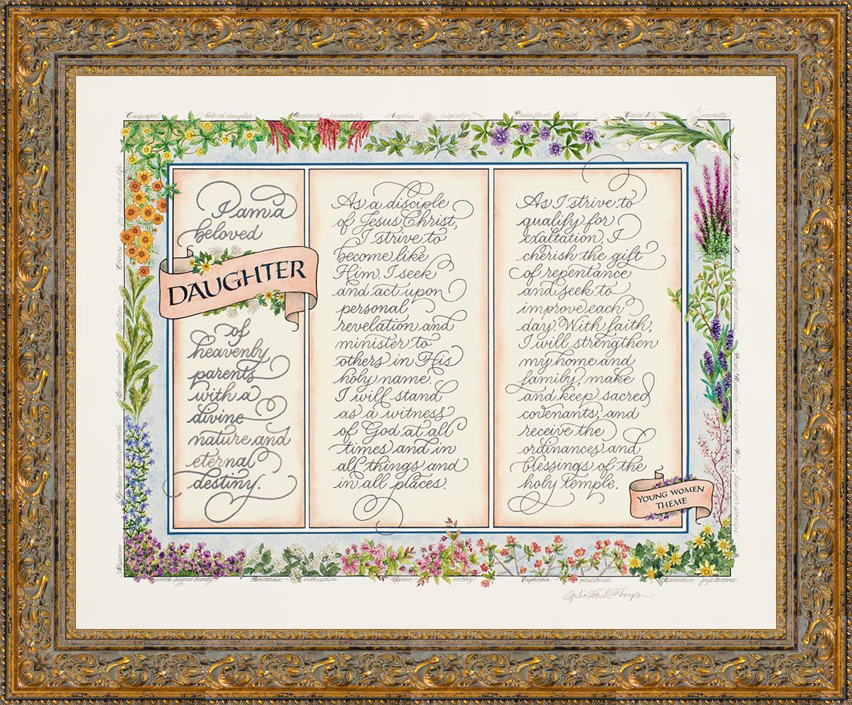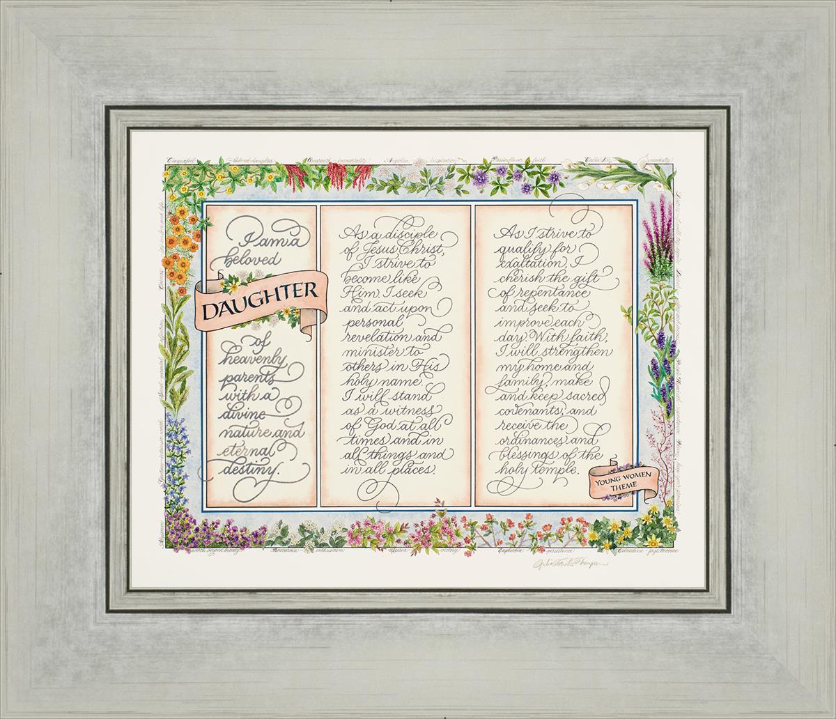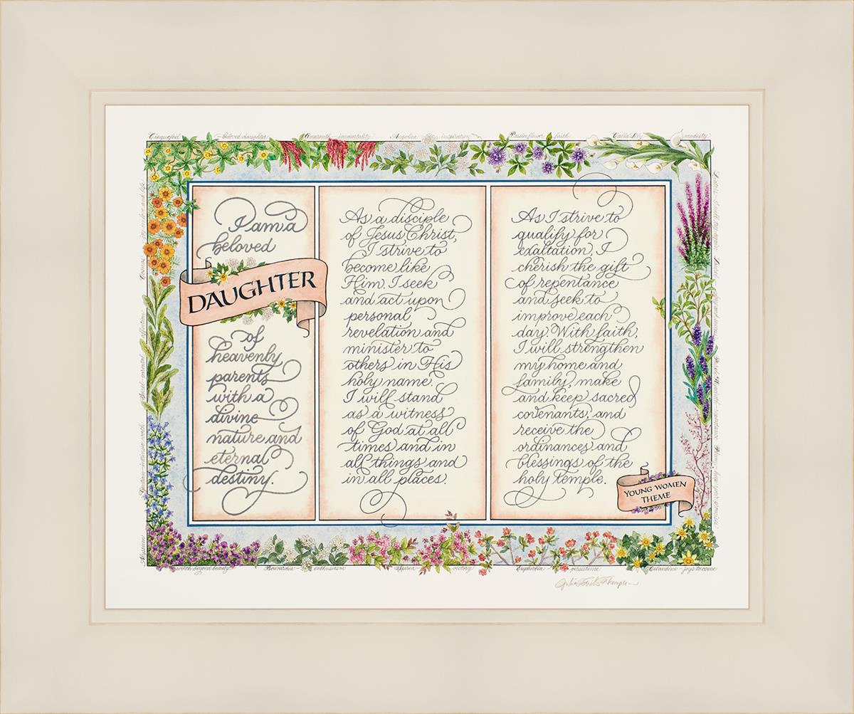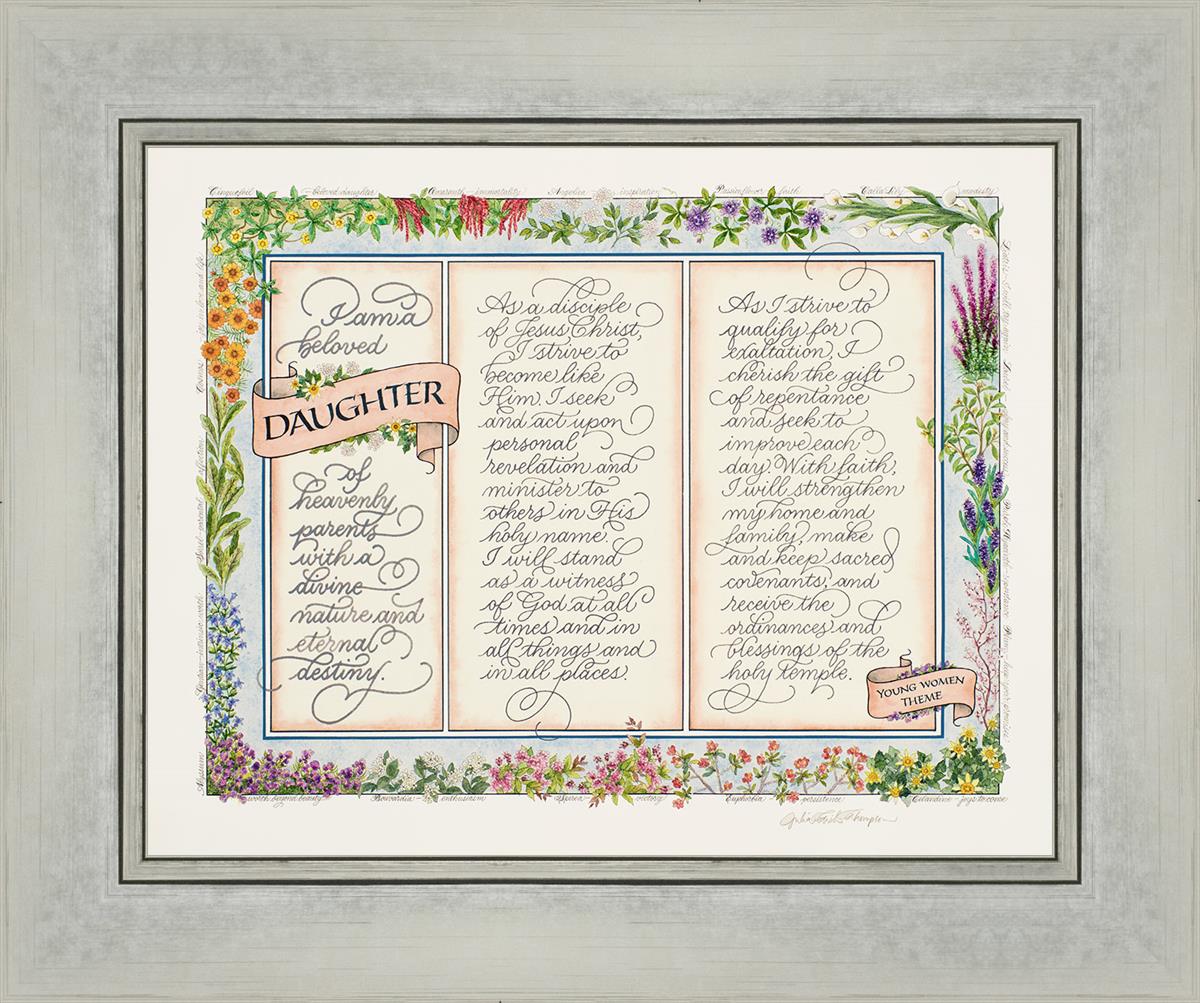 Julia Fish Thompson won a handwriting award in elementary school, took her first calligraphy class at age 13, and majored in design at Brigham Young University. She letters on anything that will hold still—paper, board, walls, metal, glass, canvas, fabric, various objects--and has maintained a home studio since her teens. She continues to study with amazing calligraphers around the world. The challenge of executing involved, hand-lettered pieces has exhilarated Julia for years and she loves to create custom works commemorating events or personalized for families or businesses. Julia and her husband David reside in Zionsville, Indiana where they recently finished raising four children. Julia met Liz Lemon Swindle at a community nativity event where they were guest artists and Liz invited her to join with other Havenlight artists, a true honor, especially for a calligrapher.