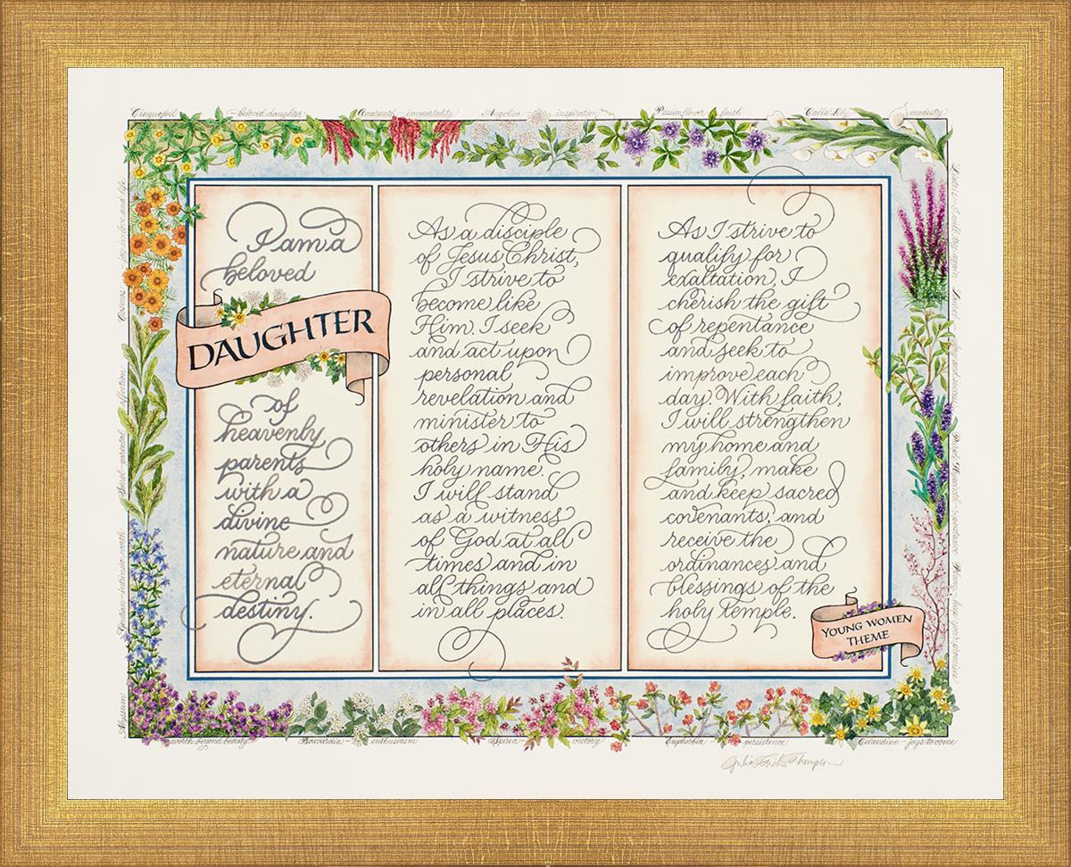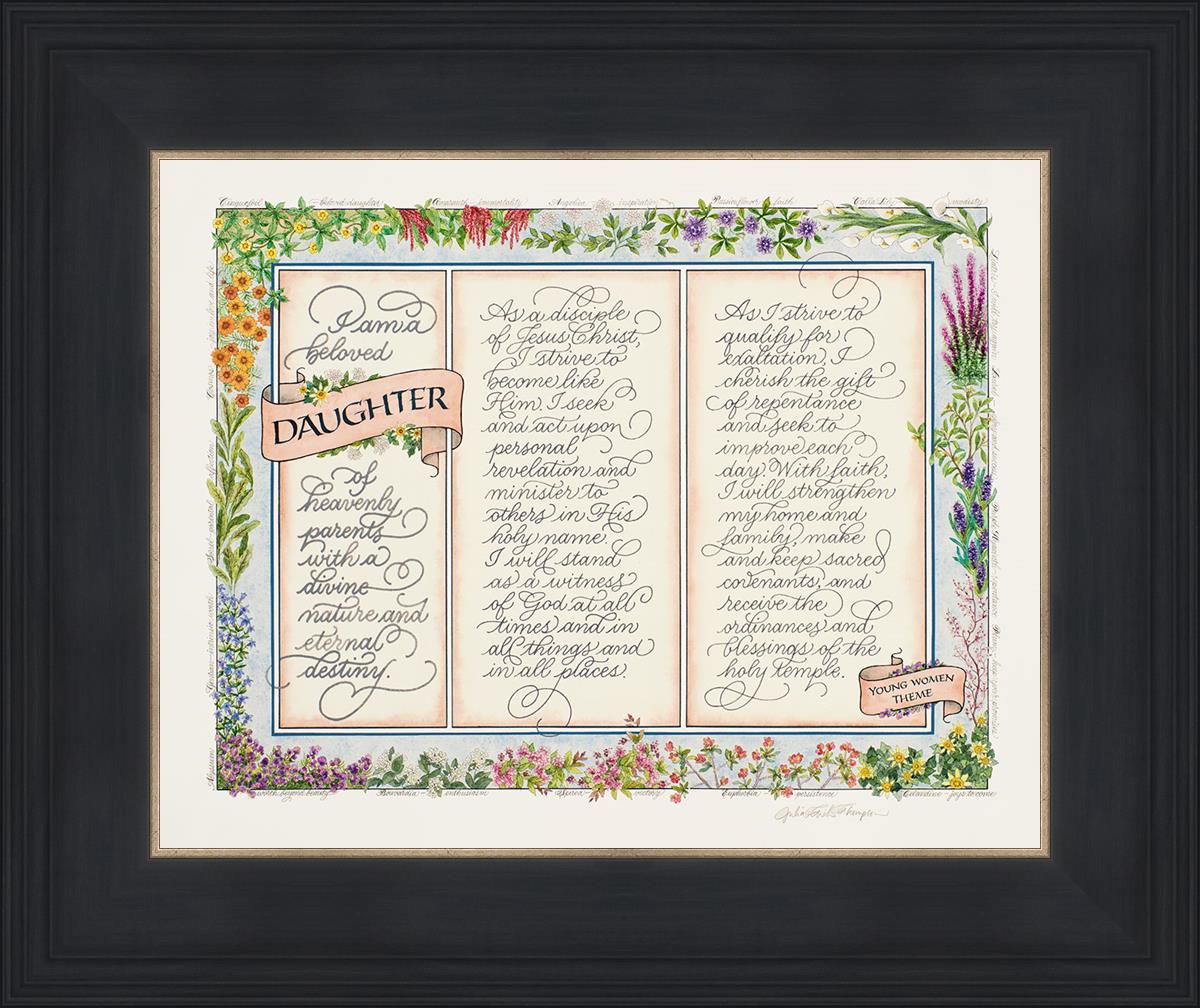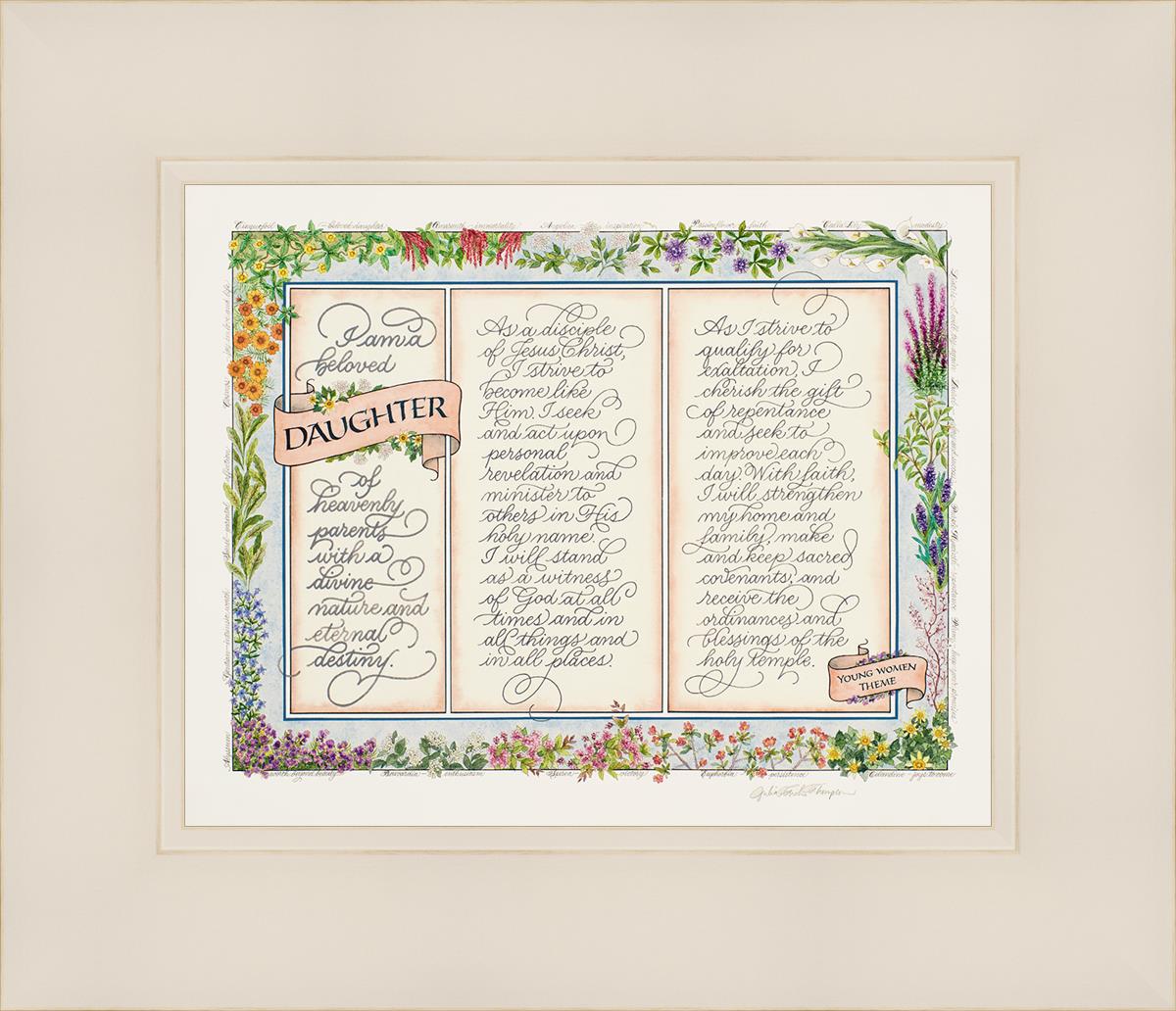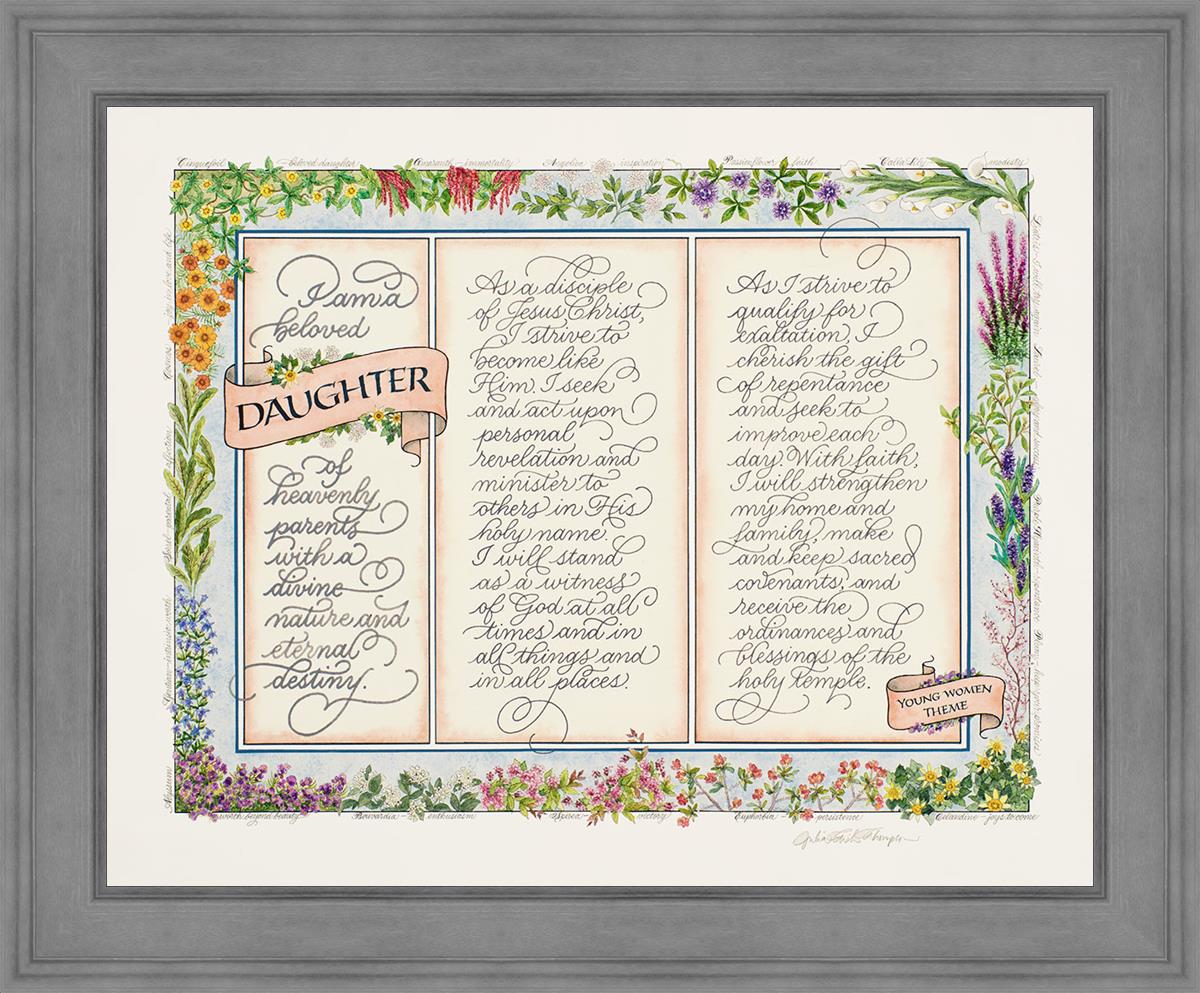 Julia Fish Thompson won a handwriting award in elementary school, took her first calligraphy class at age 13, and majored in design at Brigham Young University. She letters on anything that will hold still—paper, board, walls, metal, glass, canvas, fabric, various objects--and has maintained a home studio since her teens. She continues to study with amazing calligraphers around the world. The challenge of executing involved, hand-lettered pieces has exhilarated Julia for years and she loves to create custom works commemorating events or personalized for families or businesses. Julia and her husband David reside in Zionsville, Indiana where they recently finished raising four children. Julia met Liz Lemon Swindle at a community nativity event where they were guest artists and Liz invited her to join with other Havenlight artists, a true honor, especially for a calligrapher.