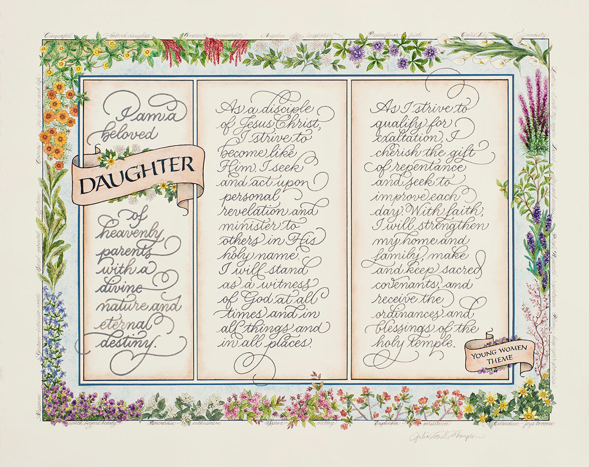 Julia Fish Thompson won a handwriting award in elementary school, took her first calligraphy class at age 13, and majored in design at Brigham Young University. She letters on anything that will hold still—paper, board, walls, metal, glass, canvas, fabric, various objects--and has maintained a home studio since her teens. She continues to study with amazing calligraphers around the world. The challenge of executing involved, hand-lettered pieces has exhilarated Julia for years and she loves to create custom works commemorating events or personalized for families or businesses. Julia and her husband David reside in Zionsville, Indiana where they recently finished raising four children. Julia met Liz Lemon Swindle at a community nativity event where they were guest artists and Liz invited her to join with other Havenlight artists, a true honor, especially for a calligrapher.